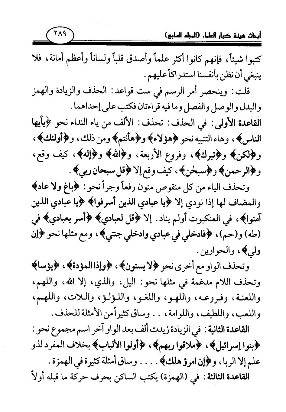 القاعدة الثانية: في الزيادة زيدت ألف بعد الواو آخر اسم مجموع نحو: بنو إسرائيل، ملاقو ربهم، أولو الألباب بخلاف المفرد لذو علم إلا الربا، وإن امرؤ هلك.... وساق أمثلة كثيرة في الهمزة.