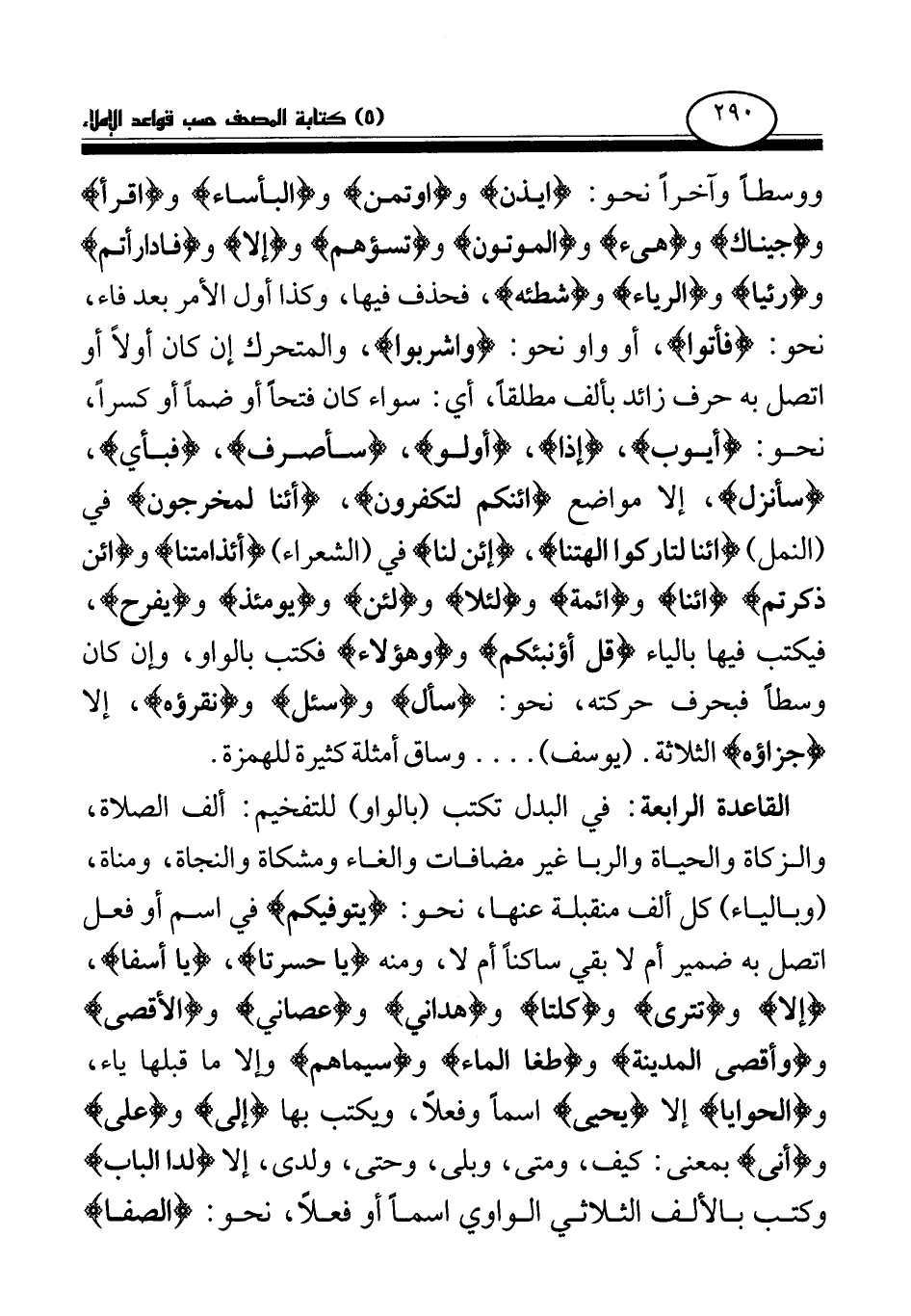 القاعدة الرابعة: في البدل تكتب (بالواو) للتفخيم: ألف الصلاة، والزكاة والحياة والربا غير مضافات والغاء ومشكاة والنجاة، ومناة، (وبالياء) كل ألف منقبلة عنها، نحو: يتوفاكم في اسم أو فعل اتصل به ضمير أم لا بقي ساكنا أم لا، ومنه يا حسرتا، يا أسفا، إلا وتترى وكلتا وهداني وعصاني والأقصى ووأقصى المدينة وطغا الماء وسيماهم وإلا ما قبلها ياء، والحوايا إلا يحيى اسما وفعلا، ويكتب بها إلى وعلى وأنى بمعنى: كيف، ومتى، وبلى، وحتى، ولدى، إلا لدى الباب وكتب بالألف الثلاثي الواوي اسما أو فعلا، نحو: الصفا