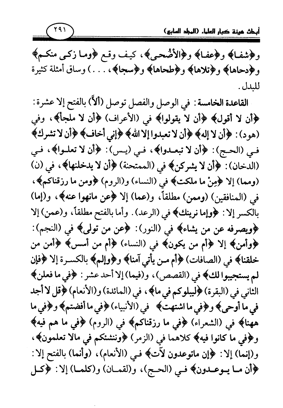 القاعدة الخامسة: في الوصل والفصل توصل (ألا) بالفتح إلا عشرة: أن لا أقول أن لا يقولوا في (الأعراف) أن لا ملجأ، وفي (هود) : أن لا إله أن لا تعبدوا إلا الله إني أخاف أن لا تشرك في (الحج) : أن لا تعبدوا، في (يس) : أن لا تعلوا، في (الدخان) : أن لا يشركن في (الممتحنة) أن لا يدخلنها، في (ن) (ومما) إلا من ما ملكت في (النساء) و (الروم) ومن ما رزقناكم، في (المنافقين) (وممن) مطلقا، و (عما) إلا عن ما نهوا عنه، و (إما) بالكسر إلا: وإما نرينك في (الرعد) .