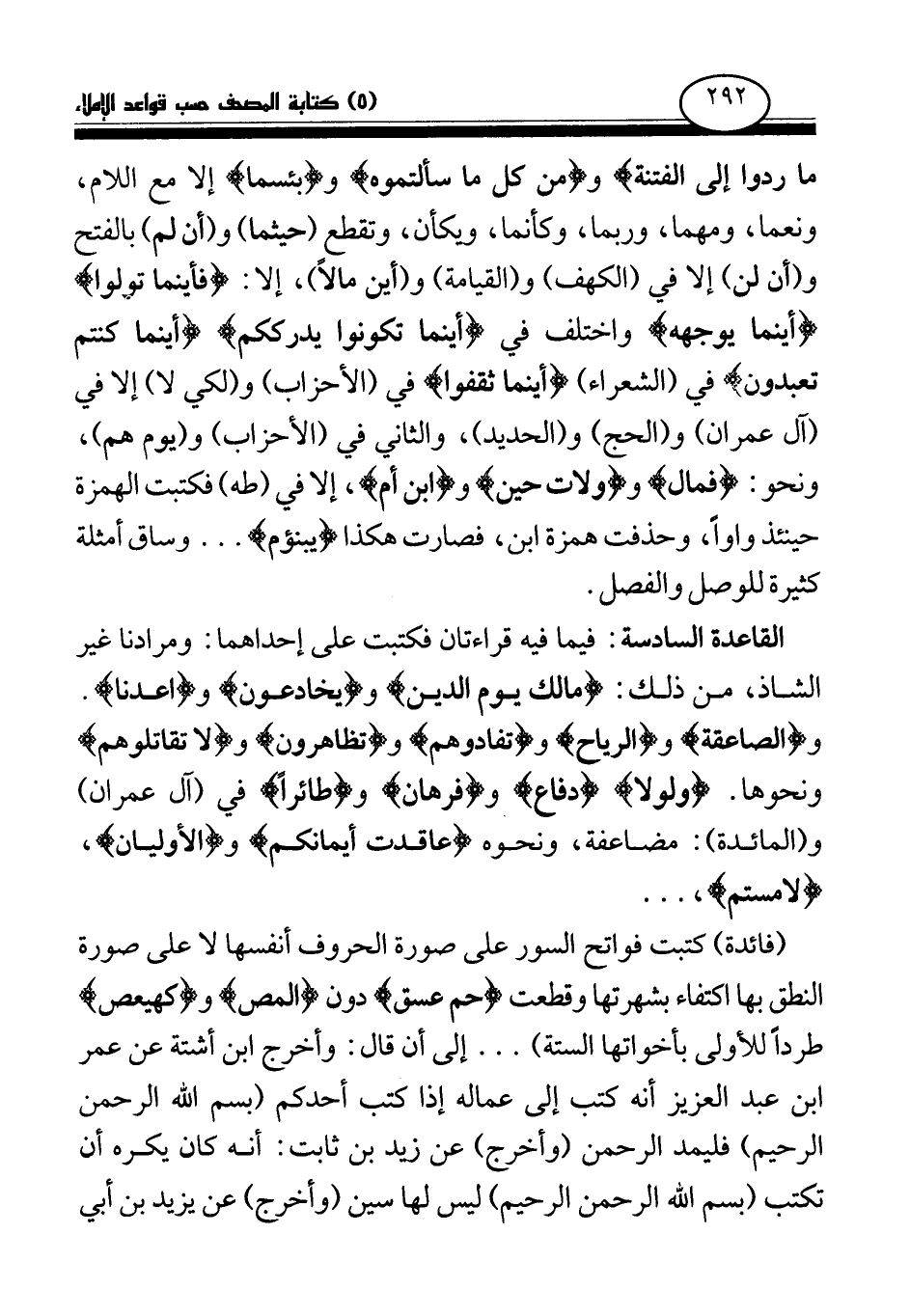 ومن كل ما سألتموه وئسما إلا مع اللام، ونعما، ومهما، وربما، وكأنما، ويكأن، وتقطع (حيثما) و (أن لم) بالفتح و (أن لن) إلا في (الكهف) و (القيامة) و (أين مالا) ، إلا: فأينما تولوا أينما يوجهه واختلف في أينما تكونوا يدرككم أينما كنتم تعبدون في (الشعراء) أينما ثقفوا في (الأحزاب) ولكي لا إلا في (آل عمران) و (الحج) و (الحديد) ، والثاني في (الأحزاب) و (يوم هم) ، ونحو: فمال وولات حين وابن أم، إلا في (طه) فكتبت الهمزة حينئذ واوا، وحذفت همزة ابن، فصارت هكذا يا ابن أم ... وساق أمثلة كثيرة للوصل والفصل.