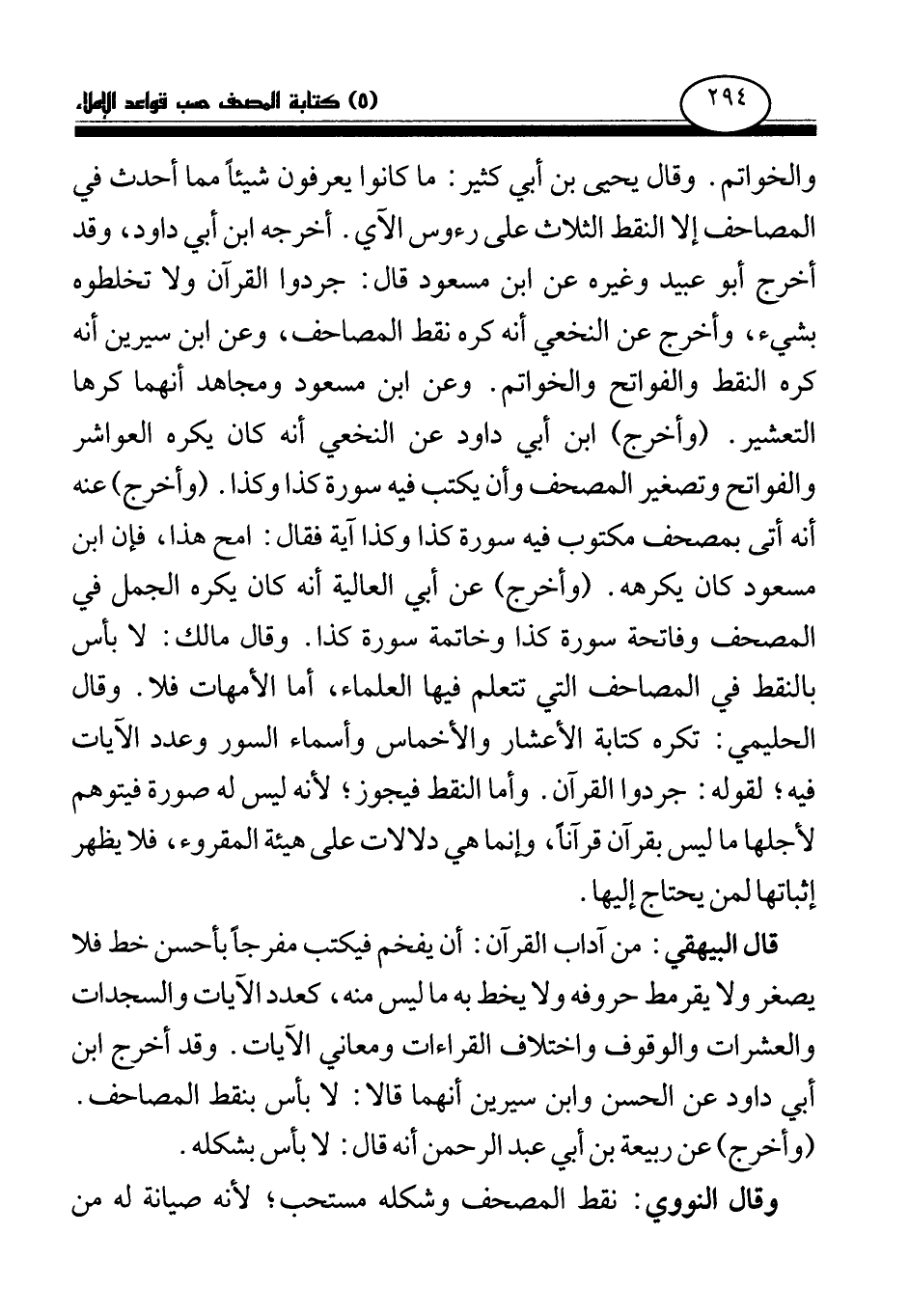 وعن ابن مسعود ومجاهد أنهما كرها التعشير. (وأخرج) ابن أبي داود عن النخعي أنه كان يكره العواشر والفواتح وتصغير المصحف، وأن يكتب فيه سورة كذا وكذا. (وأخرج) عنه أنه أتى بمصحف مكتوب فيه سورة كذا وكذا آية فقال: امح هذا، فإن ابن مسعود كان يكرهه.