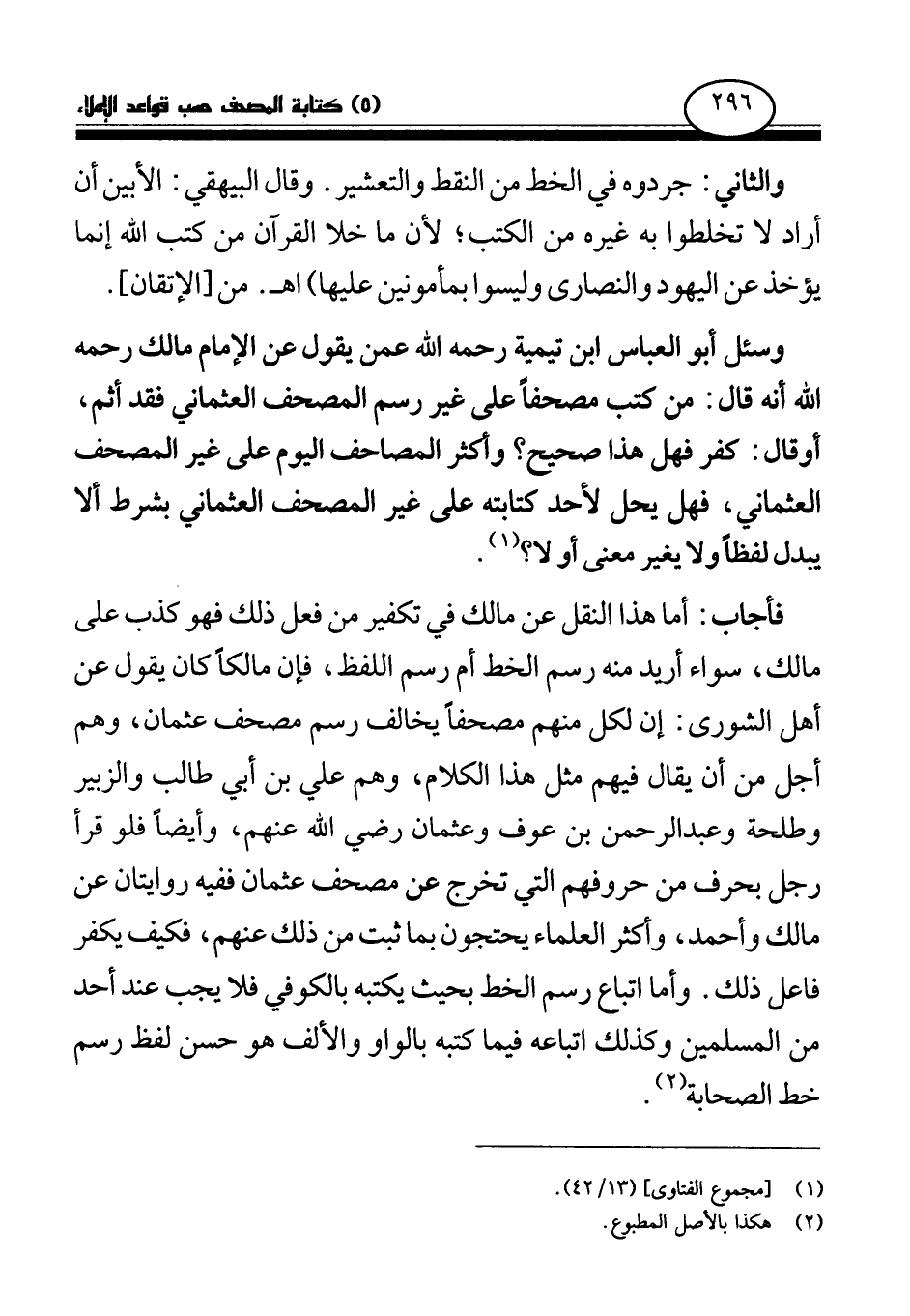 وسئل أبو العباس ابن تيمية رحمه الله عمن يقول عن الإمام مالك رحمه الله أنه قال: من كتب مصحفا على غير رسم المصحف العثماني فقد أثم، أو قال: كفر فهل هذا صحيح؟ وأكثر المصاحف اليوم على غير المصحف العثماني، فهل يحل لأحد كتابته على غير المصحف العثماني بشرط ألا يبدل لفظا ولا يغير معنى أو لا؟ (¬1)
