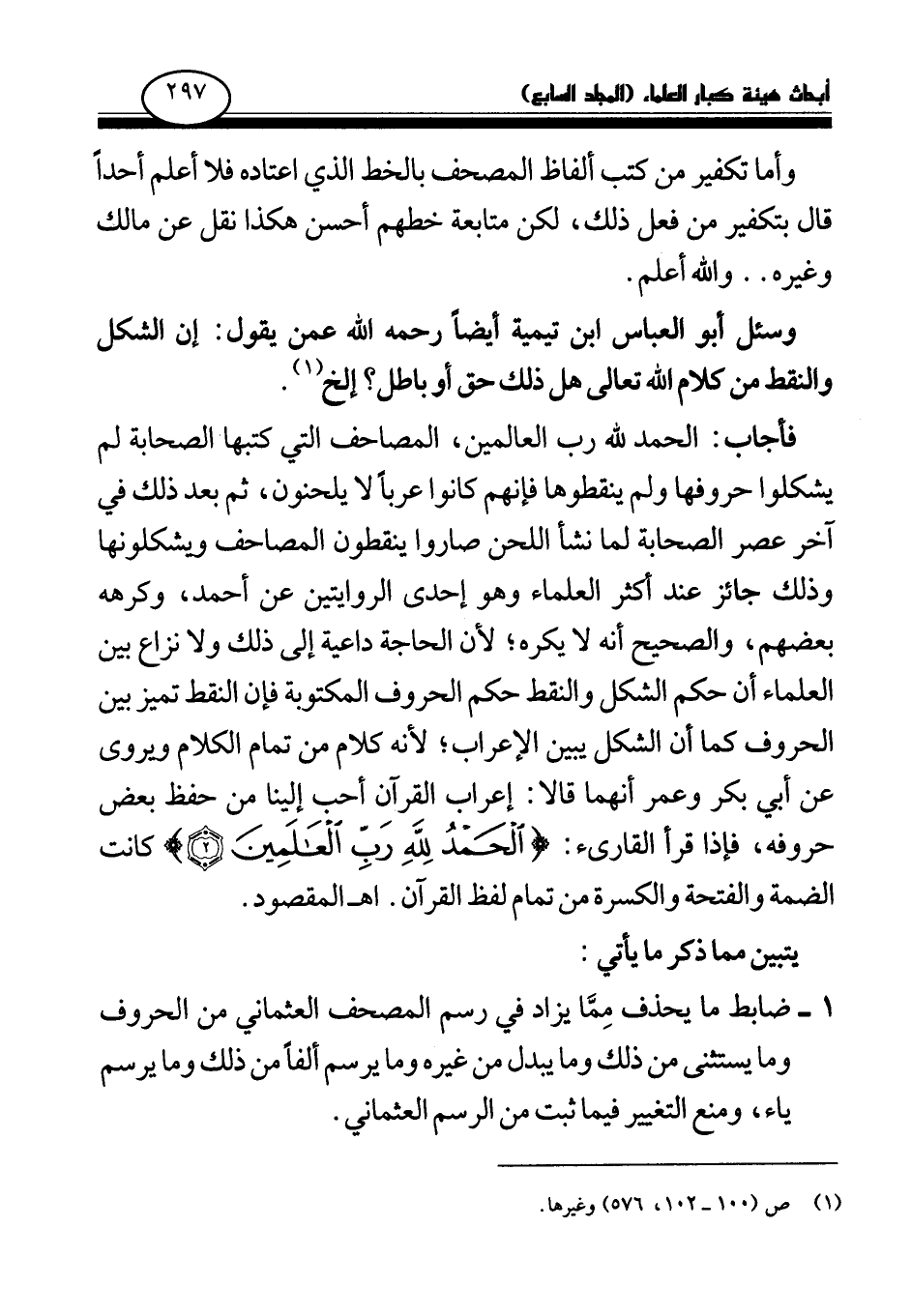 وسئل أبو العباس ابن تيمية أيضا رحمه الله عمن يقول: إن الشكل والنقط من كلام الله تعالى هل ذلك حق أو باطل؟ إلخ (¬1) .
