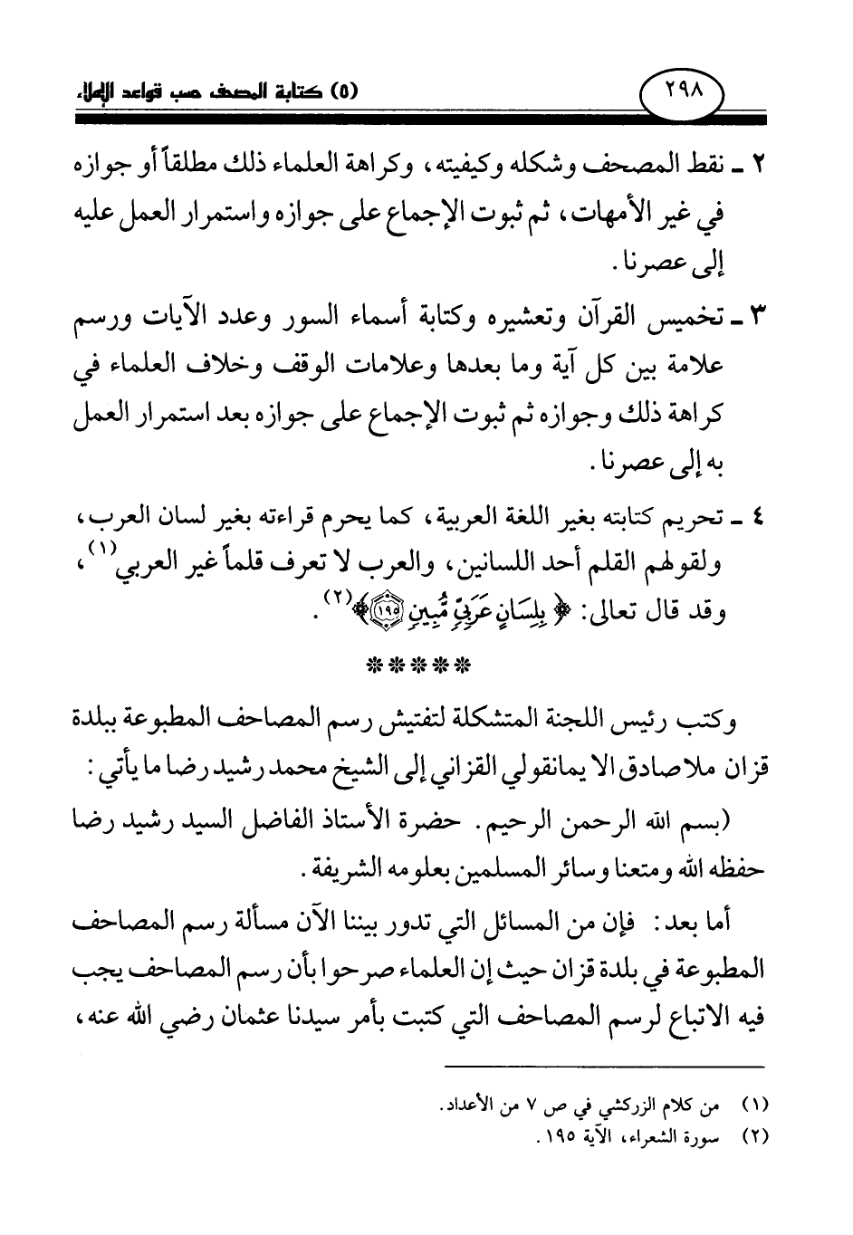 أما بعد: فإن من المسائل التي تدور بيننا الآن مسألة رسم المصاحف المطبوعة في بلدة قزان حيث إن العلماء صرحوا بأن رسم المصاحف يجب فيه الاتباع لرسم المصاحف التي كتبت بأمر سيدنا عثمان رضي الله عنه،