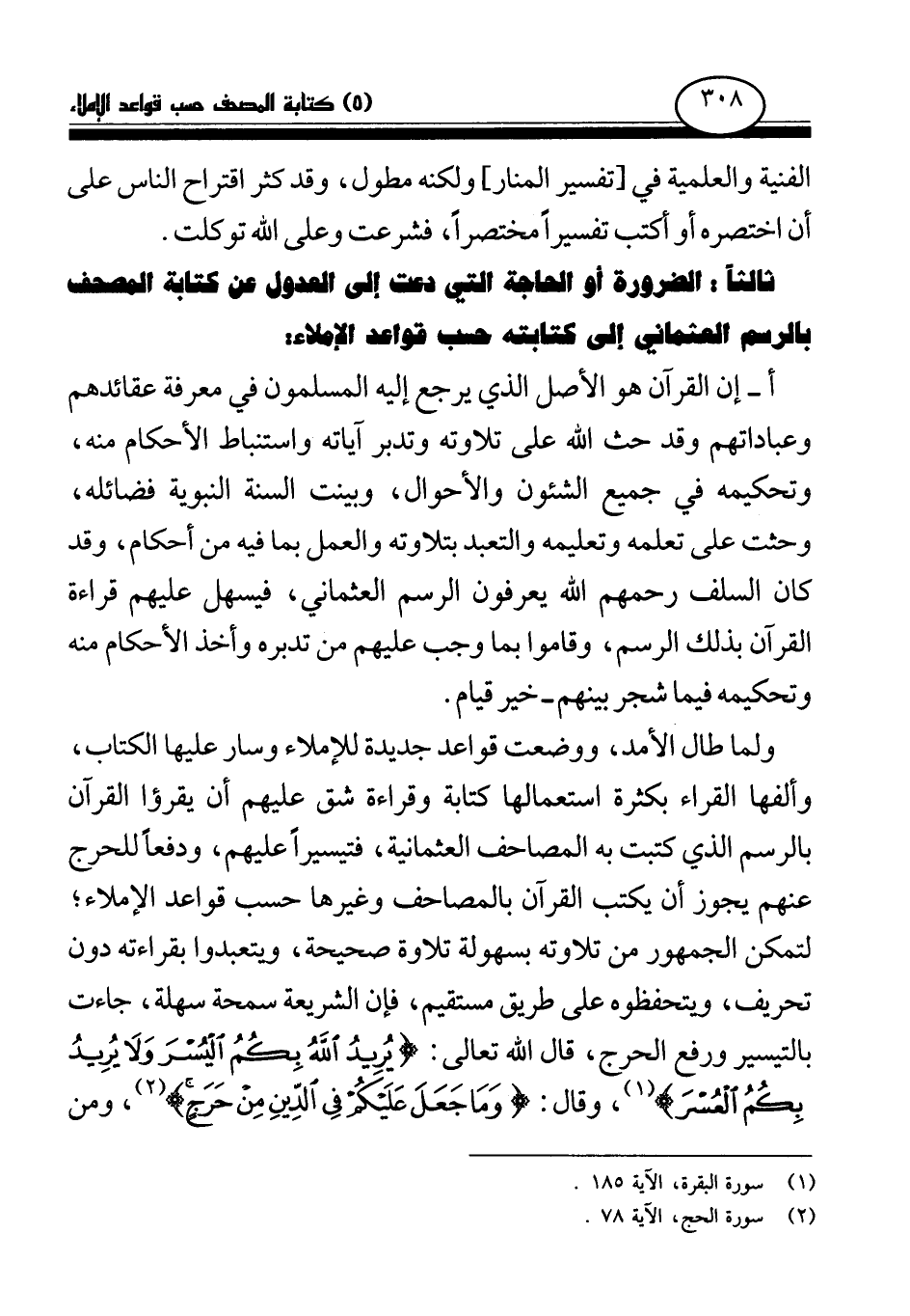 ولما طال الأمد، ووضعت قواعد جديدة للإملاء وسار عليها الكتاب، وألفها القراء بكثرة استعمالها كتابة وقراءة، شق عليهم أن يقرءوا القرآن بالرسم الذي كتبت به المصاحف العثمانية، فتيسيرا عليهم، ودفعا للحرج عنهم يجوز أن يكتب القرآن بالمصاحف وغيرها حسب قواعد الإملاء؛ لتمكن الجمهور من تلاوته بسهولة تلاوة صحيحة، ويتعبدوا بقراءته دون تحريف، ويتحفظوه على طريق مستقيم، فإن الشريعة سمحة سهلة، جاءت بالتيسير ورفع الحرج، قال الله تعالى: {يُرِيدُ اللَّهُ بِكُمُ الْيُسْرَ وَلَا يُرِيدُ بِكُمُ الْعُسْرَ} (¬1) وقال: {وَمَا جَعَلَ عَلَيْكُمْ فِي الدِّينِ مِنْ حَرَجٍ} (¬2) ومن