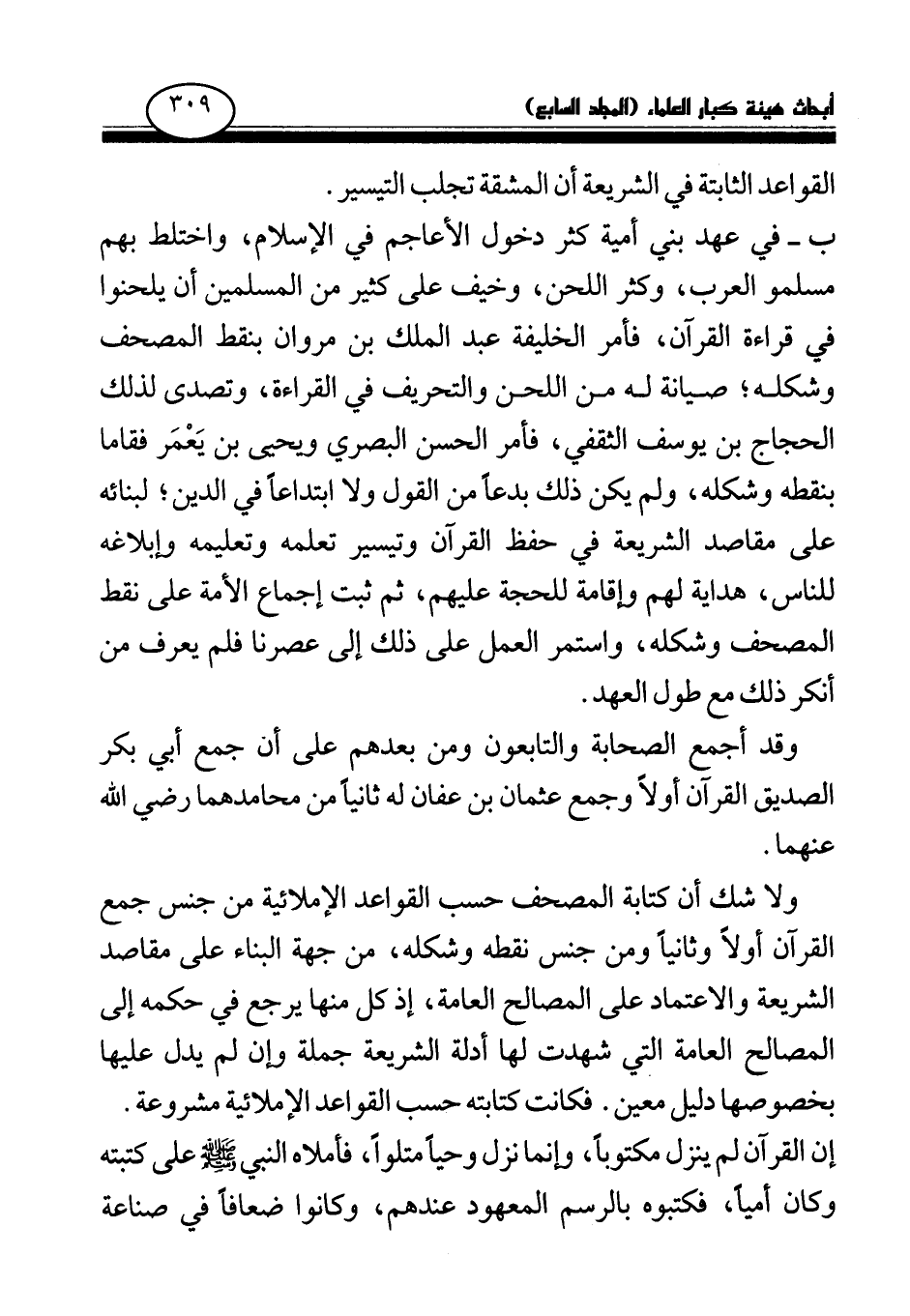 ولا شك أن كتابة المصحف حسب القواعد الإملائية من جنس جمع القرآن أولا وثانيا ومن جنس نقطه وشكله، من جهة البناء على مقاصد الشريعة والاعتماد على المصالح العامة، إذ كل منها يرجع في حكمه إلى المصالح العامة التي شهدت لها أدلة الشريعة جملة وإن لم يدل عليها بخصوصها دليل معين. فكانت كتابته حسب القواعد الإملائية مشروعة.