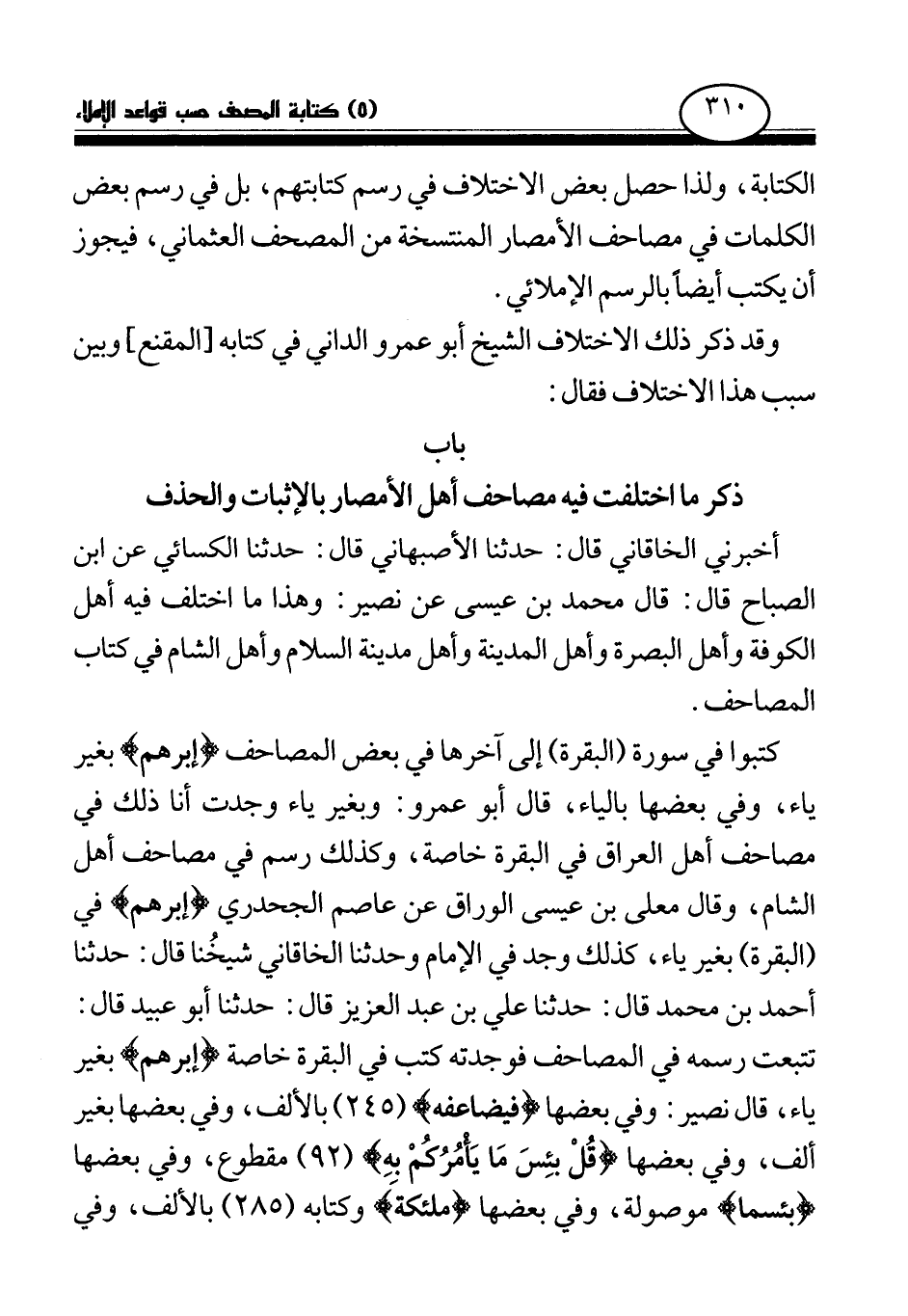 كتبوا في سورة (البقرة) إلى آخرها في بعض المصاحف (إبرهم) بغير ياء، وفي بعضها بالياء، قال أبو عمرو: وبغير ياء وجدت أنا ذلك في مصاحف أهل العراق في البقرة خاصة، وكذلك رسم في مصاحف أهل الشام، وقال معلى بن عيسى الوراق عن عاصم الجحدري (إبرهم) في (البقرة) بغير ياء، كذلك وجد في الإمام وحدثنا الخاقاني شيخنا قال: حدثنا أحمد بن محمد قال: حدثنا علي بن عبد العزيز قال: حدثنا أبو عبيد قال: تتبعت رسمه في المصاحف فوجدته كتب في البقرة خاصة (إبرهم) بغير ياء، قال نصير: وفي بعضها (فيضاعفه) (245) بالألف، وفي بعضها بغير ألف، وفي بعضها (قل بئس ما يأمركم به) (92) مقطوع، وفي بعضها (بئسما) موصولة، وفي بعضها (ملئكة) وكتابه (285) بالألف، وفي