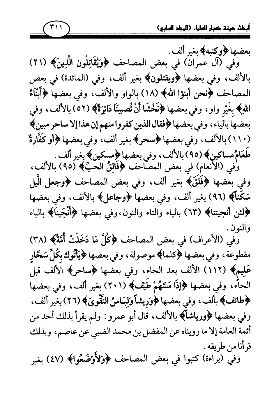 وفي (الأعراف) في بعض المصاحف (كل ما دخلت أمة) (38) مقطوعة، وفي بعضها (كلما) موصولة، وفي بعضها يأتوك بكل سحار عليم (112) الألف بعد الحاء، وفي بعضها (ساحر) الألف قبل الحاء، وفي بعضها (إذا مسهم طيف) (201) بغير ألف، وفي بعضها (طائف) بألف، وفي بعضها وريشا ولباس التقوى (26) بغير ألف، وفي بعضها (ورياشا) بالألف، قال أبو عمرو: ولم يقرأ بذلك أحد من أئمة العامة إلا ما رويناه عن المفضل بن محمد الضبي عن عاصم، وبذلك قرأنا من طريقه.