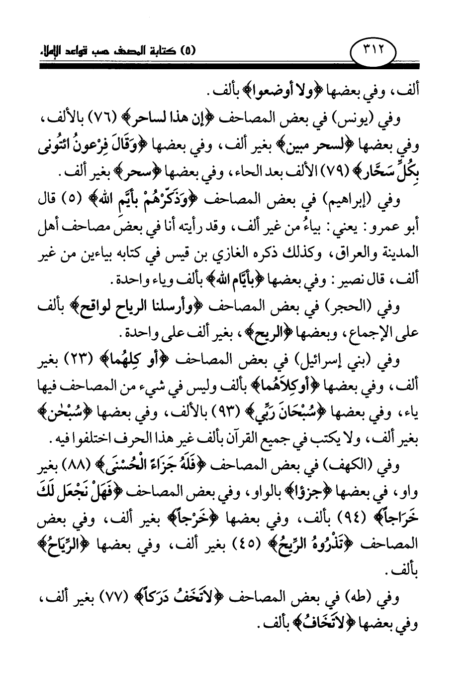 وفي (بني إسرائيل) في بعض المصاحف (أو كلهما) (23) بغير ألف، وفي بعضها (أو كلاهما) بألف وليس في شيء من المصاحف فيها ياء، وفي بعضها سبحان ربي (93) بالألف، وفي بعضها (سبحن) بغير ألف، ولا يكتب في جميع القرآن بألف غير هذا الحرف اختلفوا فيه.