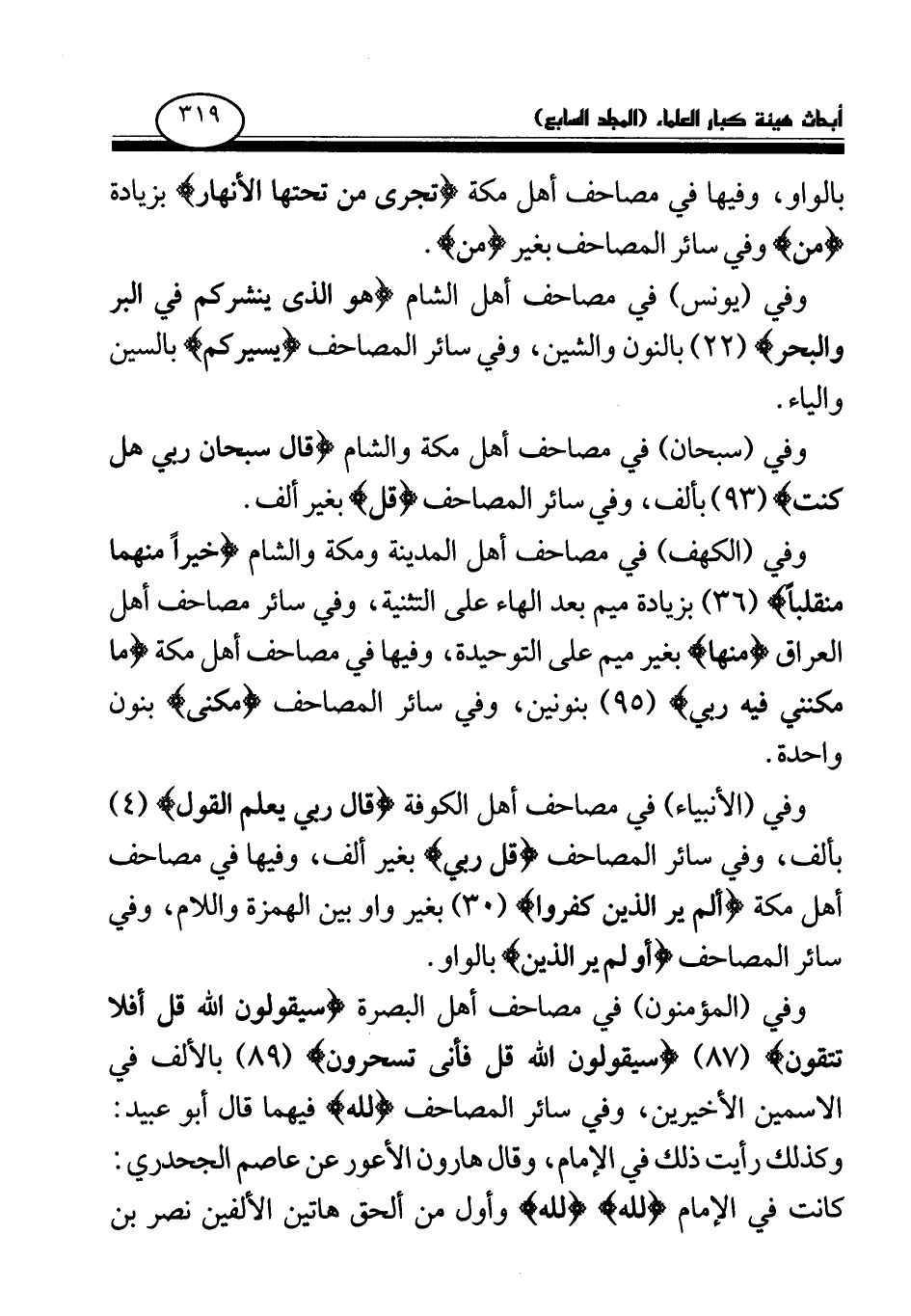 وفي (المؤمنون) في مصاحف أهل البصرة (سيقولون الله قل أفلا تتقون) (87) (سيقولون الله قل فأنى تسحرون) (89) بالألف في الاسمين الأخيرين، وفي سائر المصاحف (لله) فيهما قال أبو عبيد: وكذلك رأيت ذلك في الإمام، وقال هارون الأعور عن عاصم الجحدري: كانت في الإمام (لله) (لله) وأول من ألحق هاتين الألفين نصر بن