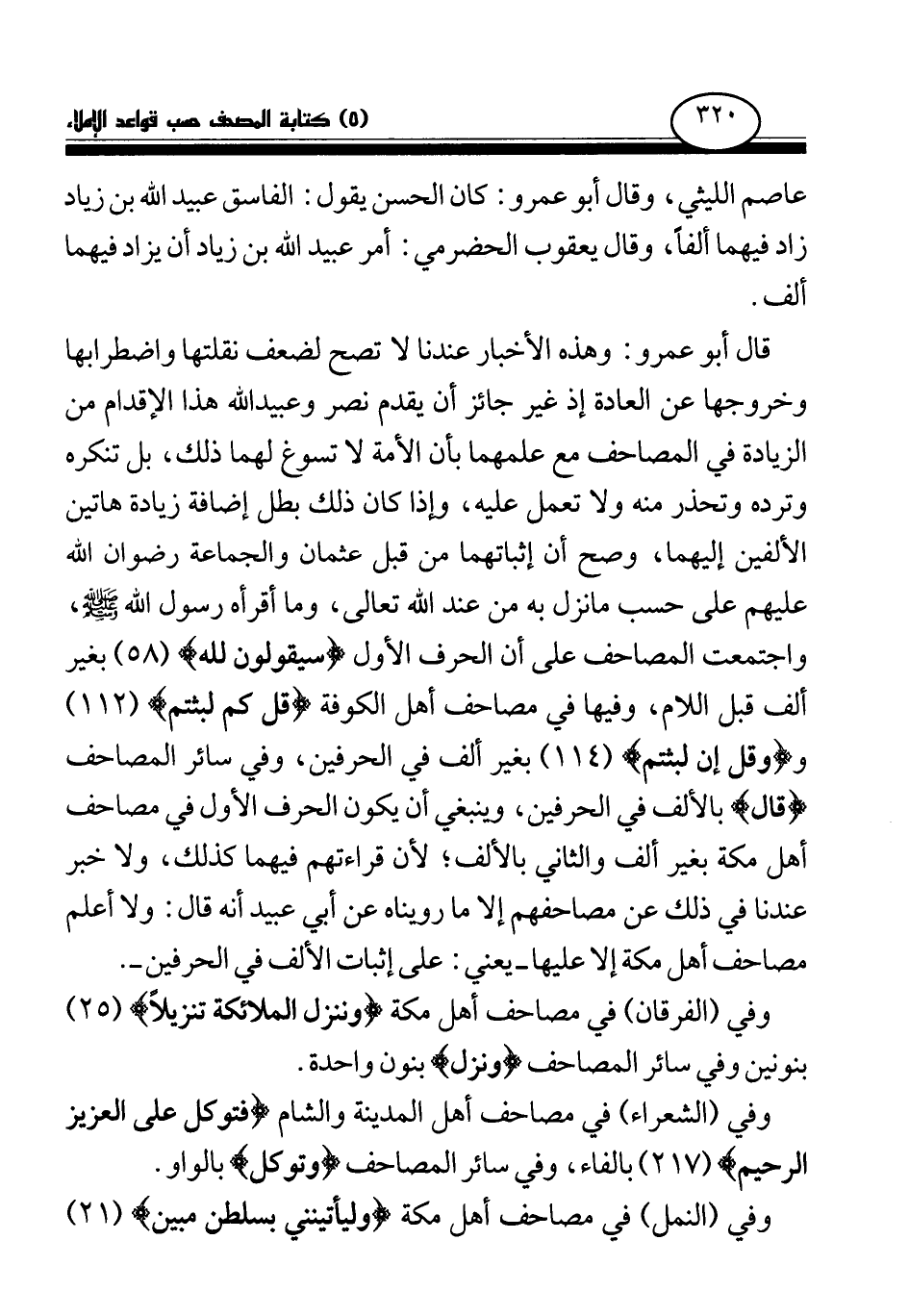 قال أبو عمرو: وهذه الأخبار عندنا لا تصح لضعف نقلتها واضطرابها وخروجها عن العادة إذ غير جائز أن يقدم نصر وعبيد الله هذا الإقدام من الزيادة في المصاحف مع علمهما بأن الأمة لا تسوغ لهما ذلك، بل تنكره وترده وتحذر منه ولا تعمل عليه، وإذا كان ذلك بطل إضافة زيادة هاتين الألفين إليهما، وصح أن إثباتهما من قبل عثمان والجماعة رضوان الله عليهم على حسب ما نزل به من عند الله تعالى، وما أقرأه رسول الله صلى الله عليه وسلم، واجتمعت المصاحف على أن الحرف الأول (سيقولون لله) (58) بغير ألف قبل اللام، وفيها في مصاحف أهل الكوفة (قل كم لبثتم) (112) و (قل إن لبثتم) (114) بغير ألف في الحرفين، وفي سائر المصاحف (قال) بالألف في الحرفين، وينبغي أن يكون الحرف الأول في مصاحف أهل مكة بغير ألف والثاني بالألف؛ لأن قراءتهم فيهما كذلك، ولا خبر عندنا في ذلك عن مصاحفهم إلا ما رويناه عن أبي عبيد أنه قال: ولا أعلم مصاحف أهل مكة إلا عليها - يعني: على إثبات الألف في الحرفين -.