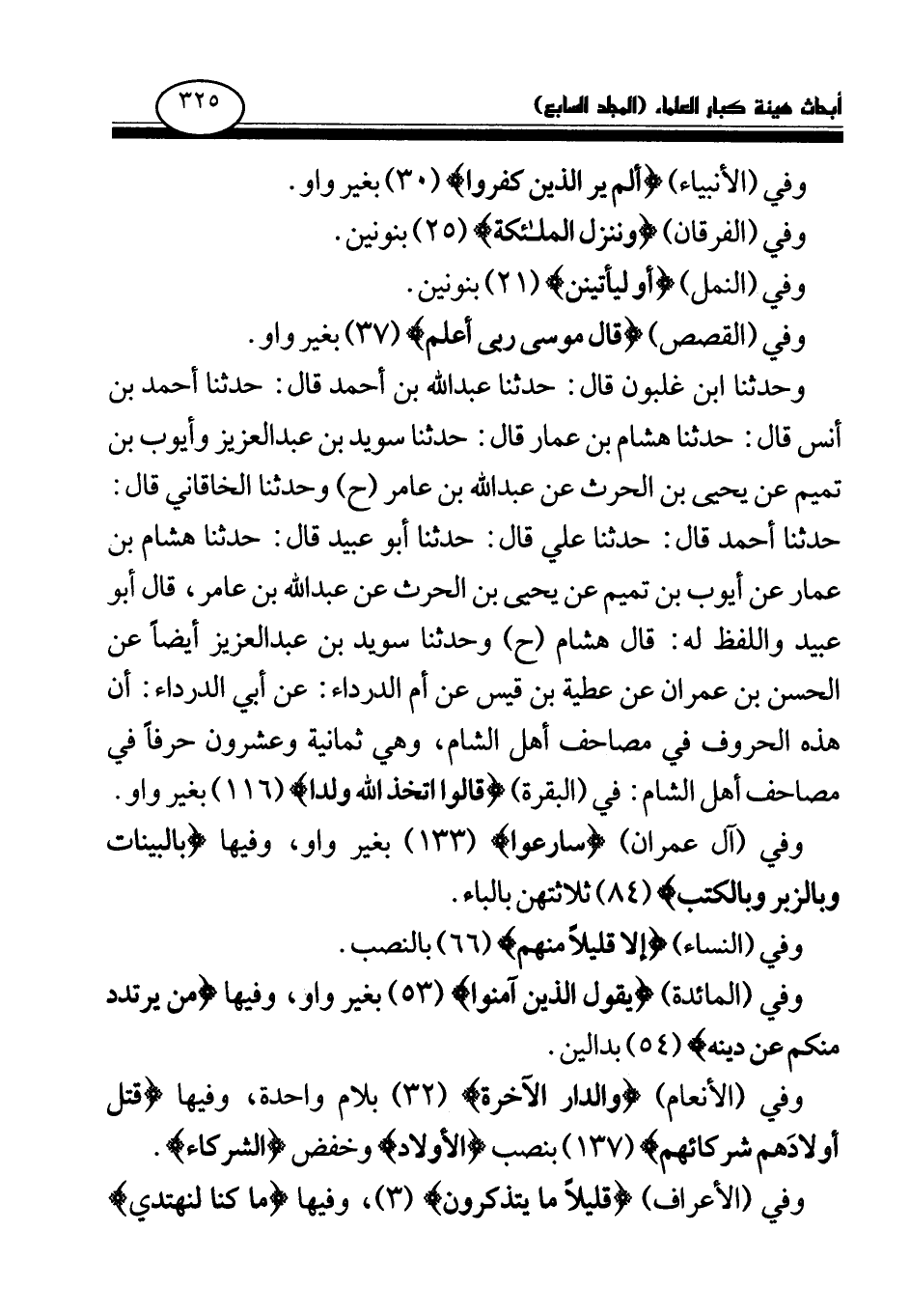 وحدثنا ابن غلبون قال: حدثنا عبد الله بن أحمد قال: حدثنا أحمد بن أنس قال: حدثنا هشام بن عمار قال: حدثنا سويد بن عبد العزيز وأيوب بن تميم عن يحيى بن الحارث عن عبد الله بن عامر (ح) وحدثنا الخاقاني قال: حدثنا أحمد قال: حدثنا علي قال: حدثنا أبو عبيد قال: حدثنا هشام بن عمار عن أيوب بن تميم عن يحيى بن الحارث عن عبد الله بن عامر، قال أبو عبيد واللفظ له: قال هشام (ح) وحدثنا سويد بن عبد العزيز أيضا عن الحسن بن عمران عن عطية بن قيس عن أم الدرداء: عن أبي الدرداء: أن هذه الحروف في مصاحف أهل الشام، وهي ثمانية وعشرون حرفا في مصاحف أهل الشام: في (البقرة) (قالوا اتخذ الله ولدا) (116) بغير واو.