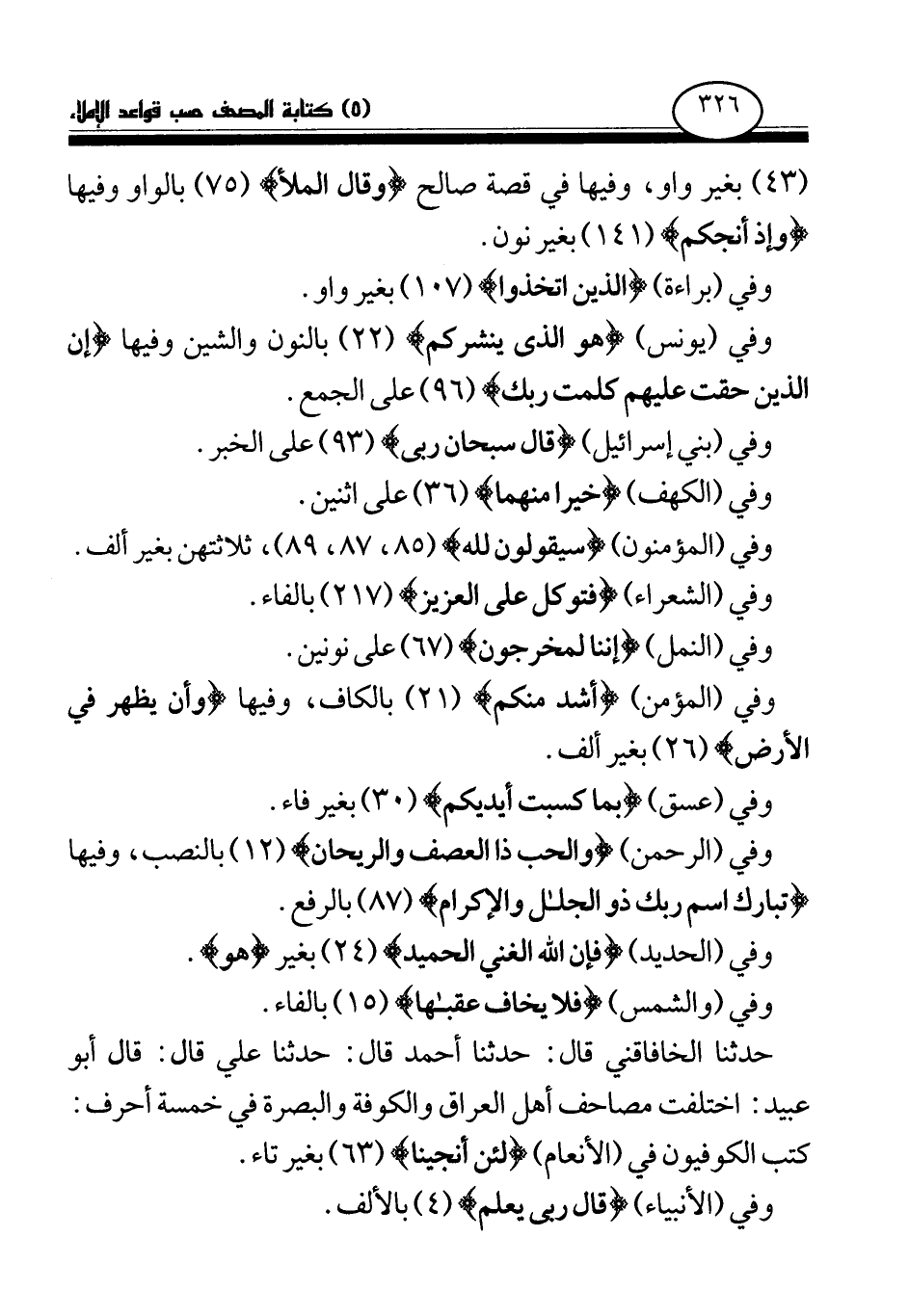 حدثنا الخافاقني قال: حدثنا أحمد قال: حدثنا علي قال: قال أبو عبيد: اختلفت مصاحف أهل العراق والكوفة والبصرة في خمسة أحرف: كتب الكوفيون في (الأنعام) (لئن أنجينا) (63) بغير تاء.