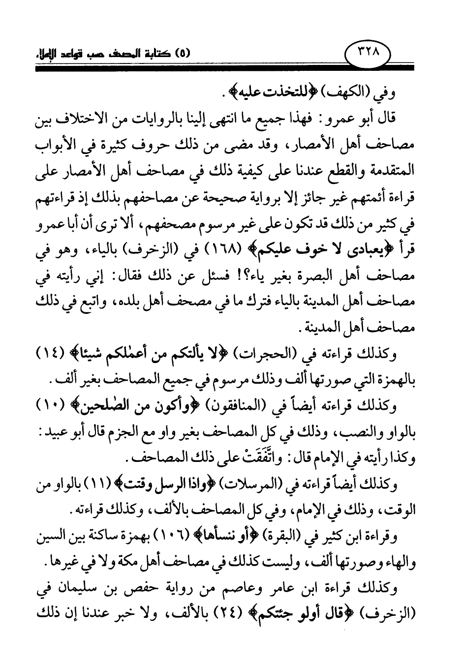 قال أبو عمرو: فهذا جميع ما انتهى إلينا بالروايات من الاختلاف بين مصاحف أهل الأمصار، وقد مضى من ذلك حروف كثيرة في الأبواب المتقدمة والقطع عندنا على كيفية ذلك في مصاحف أهل الأمصار على قراءة أئمتهم غير جائز إلا برواية صحيحة عن مصاحفهم بذلك إذ قراءتهم في كثير من ذلك قد تكون على غير مرسوم مصحفهم، ألا ترى أن أبا عمرو قرأ (يا عبادي لا خوف عليكم) (168) في (الزخرف) بالياء، وهو في مصاحف أهل البصرة بغير ياء؟ ! فسئل عن ذلك فقال: إني رأيته في مصاحف أهل المدينة بالياء فترك ما في مصحف أهل بلده، واتبع في ذلك مصاحف أهل المدينة.