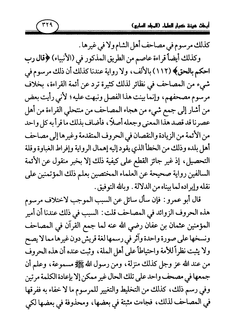 قال أبو عمرو: فإن سأل سائل عن السبب الموجب لاختلاف مرسوم هذه الحروف الزوائد في المصاحف قلت: السبب في ذلك عندنا أن أمير المؤمنين عثمان بن عفان رضي الله عنه لما جمع القرآن في المصاحف ونسخها على صورة واحدة وآثر في رسمها لغة قريش دون غيرها مما لا يصح ولا يثبت نظرا للأمة واحتياطا على أهل الملة، وثبت عنده أن هذه الحروف من عند الله عز وجل كذلك منزلة، ومن رسول الله صلى الله عليه وسلم مسموعة، وعلم أن جمعها في مصحف واحد على تلك الحال غير ممكن إلا بإعادة الكلمة مرتين وفي رسم ذلك، كذلك من التخليط والتغيير للمرسوم ما لا خفاء به ففرقها في المصاحف لذلك، فجاءت مثبتة في بعضها، ومحذوفة في بعضها لكي