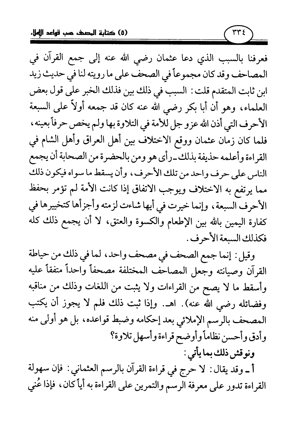 وقيل: إنما جمع الصحف في مصحف واحد، لما في ذلك من حياطة القرآن وصيانته وجعل المصاحف المختلفة مصحفا واحدا متفقا عليه وأسقط ما لا يصح من القراءات ولا يثبت من اللغات وذلك من مناقبه وفضائله رضي الله عنه) . اهـ. وإذا ثبت ذلك فلم لا يجوز أن يكتب المصحف بالرسم الإملائي بعد إحكامه وضبط قواعده، بل هو أولى منه وأدق وأحسن نظاما وأوضح قراءة وأسهل تلاوة؟