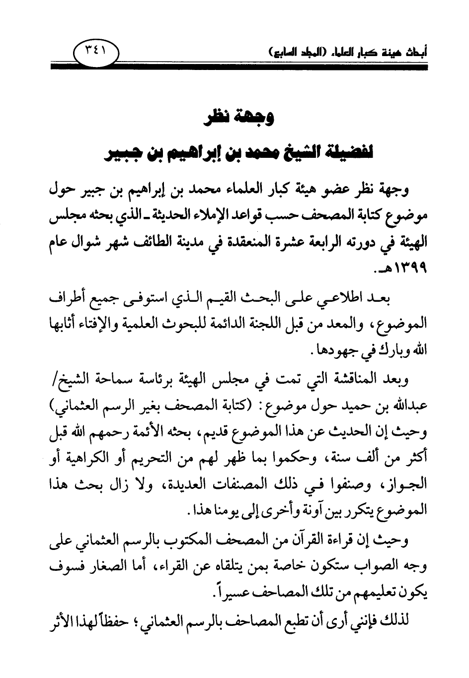 وجهة نظر عضو هيئة كبار العلماء محمد بن إبراهيم بن جبير حول موضوع كتابة المصحف حسب قواعد الإملاء الحديثة - الذي بحثه مجلس الهيئة في دورته الرابعة عشرة المنعقدة في مدينة الطائف شهر شوال عام 1399 هـ.
