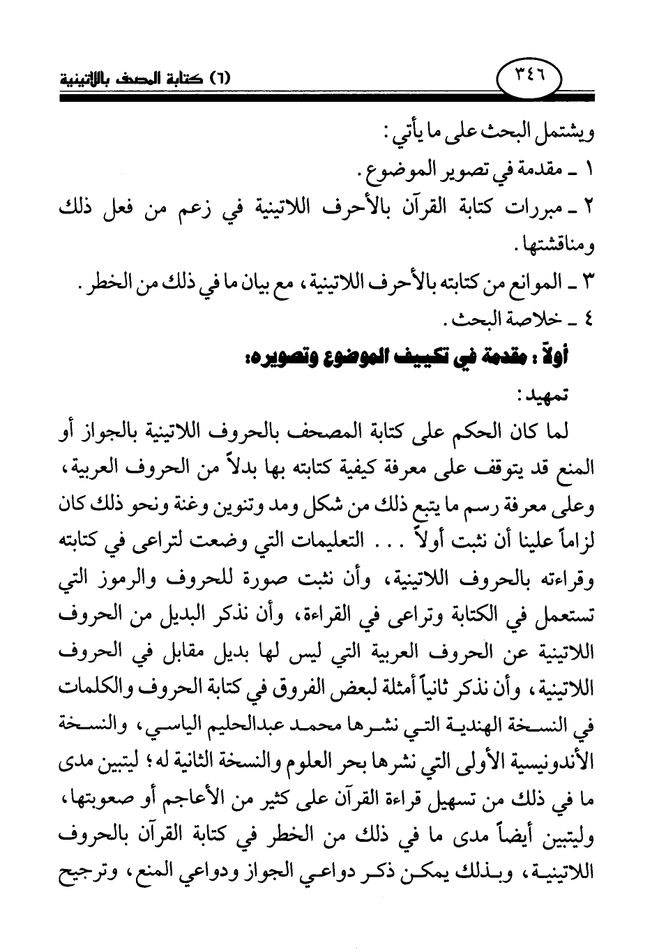 لما كان الحكم على كتابة المصحف بالحروف اللاتينية بالجواز أو المنع قد يتوقف على معرفة كيفية كتابته بها بدلا من الحروف العربية، وعلى معرفة رسم ما يتبع ذلك من شكل ومد وتنوين وغنة ونحو ذلك كان لزاما علينا أن نثبت أولا. . . التعليمات التي وضعت لتراعى في كتابته وقراءته بالحروف اللاتينية، وأن نثبت صورة للحروف والرموز التي تستعمل في الكتابة وتراعى في القراءة، وأن نذكر البديل من الحروف اللاتينية عن الحروف العربية التي ليس لها بديل مقابل في الحروف اللاتينية، وأن نذكر ثانيا أمثلة لبعض الفروق في كتابة الحروف والكلمات في النسخة الهندية التي نشرها محمد عبد الحليم الياسي، والنسخة الإندونيسية الأولى التي نشرها بحر العلوم والنسخة الثانية له؛ ليتبين مدى ما في ذلك من تسهيل قراءة القرآن على كثير من الأعاجم أو صعوبتها، وليتبين أيضا مدى ما في ذلك من الخطر في كتابة القرآن بالحروف اللاتينية، وبذلك يمكن ذكر دواعي الجواز ودواعي المنع، وترجيح