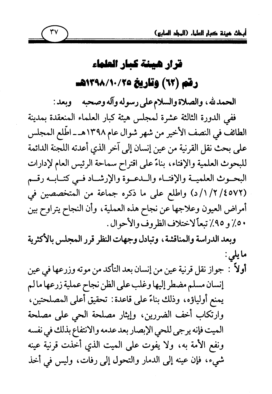 ففي الدورة الثالثة عشرة لمجلس هيئة كبار العلماء المنعقدة بمدينة الطائف في النصف الأخير من شهر شوال عام 1398 هـ - اطلع المجلس على بحث نقل القرنية من عين إنسان إلى آخر الذي أعدته اللجنة الدائمة للبحوث العلمية والإفتاء، بناء على اقتراح سماحة الرئيس العام لإدارات البحوث العلمية والإفتاء والدعوة والإرشاد في كتابه رقم (4572\2\1\ د) واطلع على ما ذكره جماعة من المتخصصين في أمراض العيون وعلاجها عن نجاح هذه العملية، وأن النجاح يتراوح بين 50% و 95% تبعا لاختلاف الظروف والأحوال.