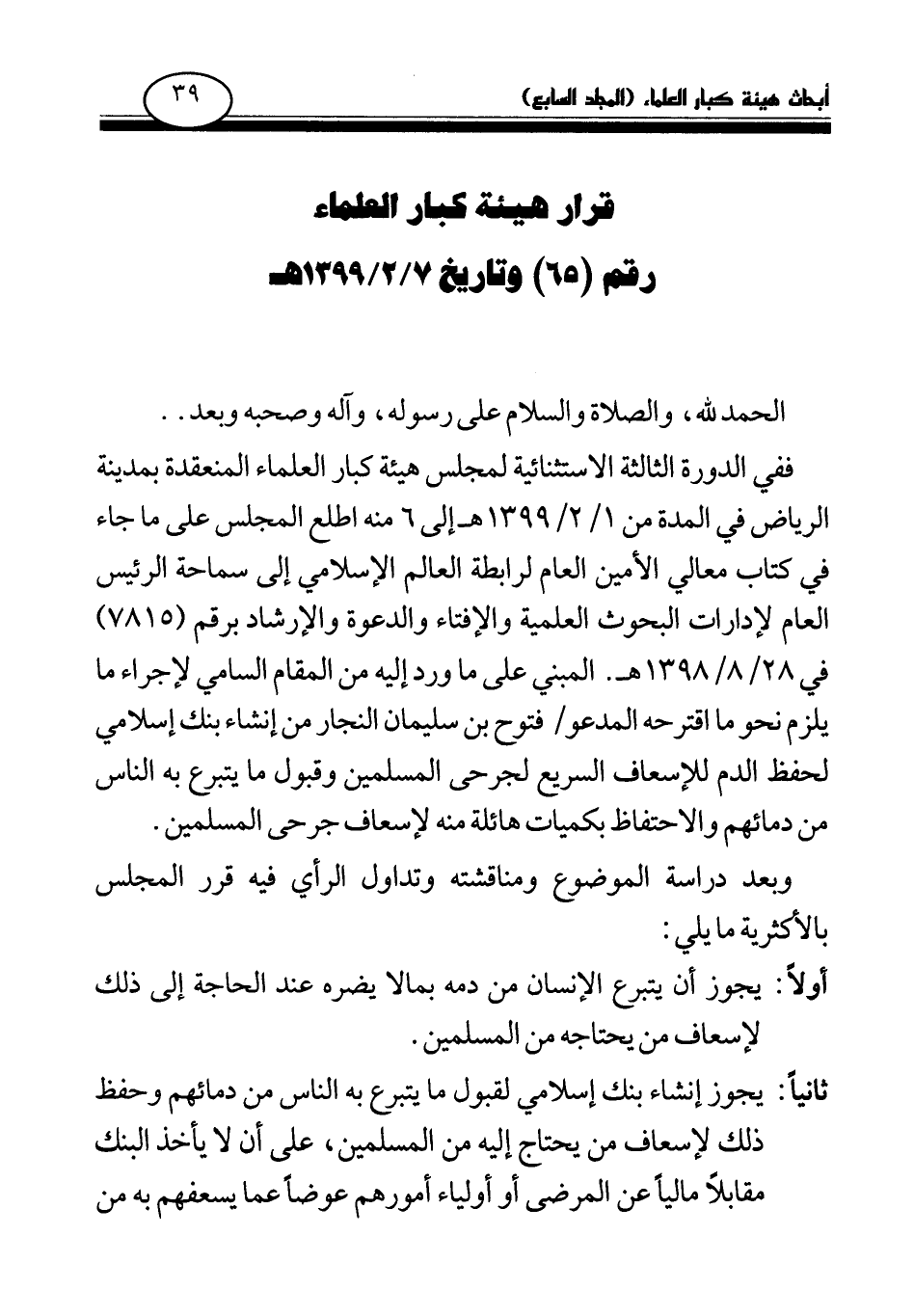 ففي الدورة الثالثة الاستثنائية لمجلس هيئة كبار العلماء المنعقدة بمدينة الرياض في المدة من 1\2\1399هـ إلى 6 منه اطلع المجلس على ما جاء في كتاب معالي الأمين العام لرابطة العالم الإسلامي إلى سماحة الرئيس العام لإدارات البحوث العلمية والإفتاء والدعوة والإرشاد برقم (7815) في 28\8\1398 هـ. المبني على ما ورد إليه من المقام السامي لإجراء ما يلزم نحو ما اقترحه المدعو\ فتوح بن سليمان النجار من إنشاء بنك إسلامي؛ لحفظ الدم للإسعاف السريع لجرحى المسلمين وقبول ما يتبرع به الناس من دمائهم والاحتفاظ بكميات هائلة منه لإسعاف جرحى المسلمين.