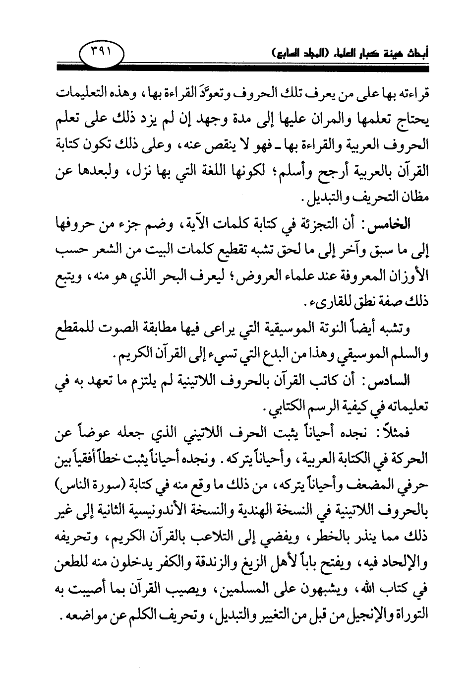 قراءته بها على من يعرف تلك الحروف وتعود القراءة بها، وهذه التعليمات يحتاج تعلمها والمران عليها إلى مدة وجهد إن لم يزد ذلك على تعلم الحروف العربية والقراءة بها - فهو لا ينقص عنه، وعلى ذلك تكون كتابة القرآن بالعربية أرجح وأسلم؛ لكونها اللغة التي بها نزل، ولبعدها عن مظان التحريف والتبديل.