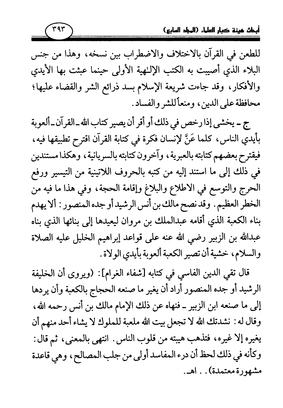 ج - يخشى إذا رخص في ذلك أو أقر أن يصير كتاب الله - القرآن - ألعوبة بأيدي الناس، كلما عن لإنسان فكرة في كتابة القرآن اقترح تطبيقها فيه، فيقترح بعضهم كتابته بالعبرية، وآخرون كتابته بالسريانية، وهكذا مستندين في ذلك إلى ما استند إليه من كتبه بالحروف اللاتينية من التيسير ورفع الحرج والتوسع في الاطلاع والبلاغ وإقامة الحجة، وفي هذا ما فيه من الخطر العظيم. وقد نصح مالك بن أنس الرشيد أو جده المنصور: ألا يهدم بناء الكعبة الذي أقامه عبد الملك بن مروان ليعيدها إلى بنائها الذي بناه عبد الله بن الزبير رضي الله عنه على قواعد إبراهيم الخليل عليه الصلاة والسلام، خشية أن تصير الكعبة ألعوبة بأيدي الولاة.