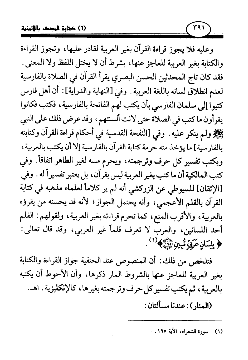 وعليه فلا يجوز قراءة القرآن بغير العربية لقادر عليها، وتجوز القراءة والكتابة بغير العربية للعاجز عنها، بشرط أن لا يختل اللفظ ولا المعنى فقد كان تاج المحدثين الحسن البصري يقرأ القرآن في الصلاة بالفارسية لعدم انطلاق لسانه باللغة العربية. وفي [النهاية والدراية] : أن أهل فارس كتبوا إلى سلمان الفارسي بأن يكتب لهم الفاتحة بالفارسية، فكتب فكانوا يقرءون ما كتب في الصلاة حتى لانت ألسنتهم، وقد عرض ذلك على النبي صلى الله عليه وسلم ولم ينكر عليه. وفي [النفحة القدسية في أحكام قراءة القرآن وكتابته بالفارسية] ما يؤخذ منه حرمة كتابة القرآن بالفارسية إلا أن يكتب بالعربية ويكتب تفسير كل حرف وترجمته، ويحرم مسه لغير الطاهر اتفاقا. وفي كتب المالكية أن ما كتب بغير العربية ليس بقرآن، بل يعتبر تفسيرا له. وفي [الإتقان] للسيوطي عن الزركشي أنه لم ير كلاما لعلماء مذهبه في كتابة القرآن بالقلم الأعجمي، وأنه يحتمل الجواز؛ لأنه قد يحسنه من يقرؤه بالعربية، والأقرب المنع، كما تحرم قراءته بغير العربية، ولقولهم: القلم أحد اللسانين، والعرب لا تعرف قلما غير العربي، وقد قال تعالى {بِلِسَانٍ عَرَبِيٍّ مُبِينٍ} (¬1)