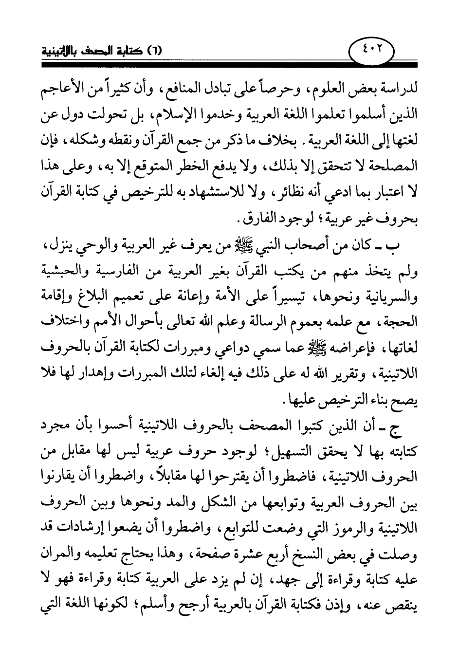 ج - أن الذين كتبوا المصحف بالحروف اللاتينية أحسوا بأن مجرد كتابته بها لا يحقق التسهيل؛ لوجود حروف عربية ليس لها مقابل الحروف اللاتينية، فاضطروا أن يقترحوا لها مقابلا، واضطروا أن يقارنوا بين الحروف العربية وتوابعها من الشكل والمد ونحوها وبين الحروف اللاتينية والرموز التي وضعت للتوابع، واضطروا أن يضعوا إرشادات قد وصلت في بعض النسخ أربع عشرة صفحة، وهذا يحتاج تعليمه والمران عليه كتابة وقراءة إلى جهد، إن لم يزد على العربية كتابة وقراءة فهو لا ينقص عنه، وإذن فكتابة القرآن بالعربية أرجح وأسلم؛ لكونها اللغة التي
