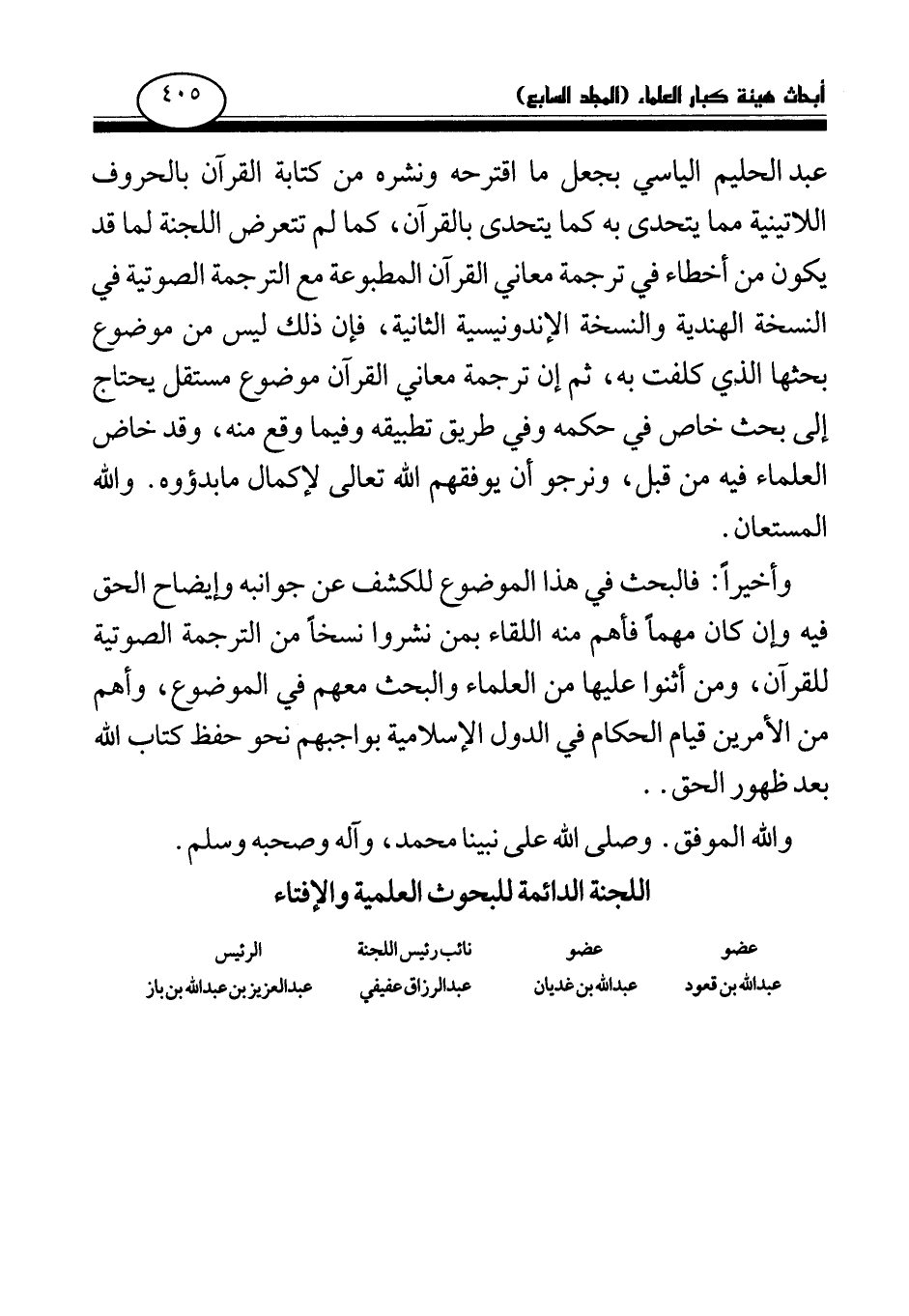 عبد الحليم الياسي بجعل ما اقترحه ونشره من كتابة القرآن بالحروف اللاتينية مما يتحدى به كما يتحدى بالقرآن، كما لم تتعرض اللجنة لما قد يكون من أخطاء في ترجمة معاني القرآن المطبوعة مع الترجمة الصوتية في النسخة الهندية والنسخة الإندونيسية الثانية، فإن ذلك ليس من موضوع بحثها الذي كلفت به، ثم إن ترجمة معاني القرآن موضوع مستقل يحتاج إلى بحث خاص في حكمه وفي طريق تطبيقه وفيما وقع منه، وقد خاض العلماء فيه من قبل، ونرجو أن يوفقهم الله تعالى لإكمال ما بدءوه. والله المستعان.