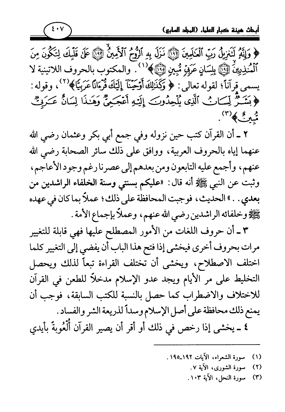 2 - أن القرآن كتب حين نزوله وفي جمع أبي بكر وعثمان رضي الله عنهما إياه بالحروف العربية، ووافق على ذلك سائر الصحابة رضي الله عنهم، وأجمع عليه التابعون ومن بعدهم إلى عصرنا رغم وجود الأعاجم، وثبت عن النبي صلى الله عليه وسلم أنه قال: «عليكم بسنتي وسنة الخلفاء الراشدين من بعدي (¬7) » . . الحديث، فوجبت المحافظة على ذلك؛ عملا بما كان في عهده صلى الله عليه وسلم وخلفائه الراشدين رضي الله عنهم، وعملا بإجماع الأمة.