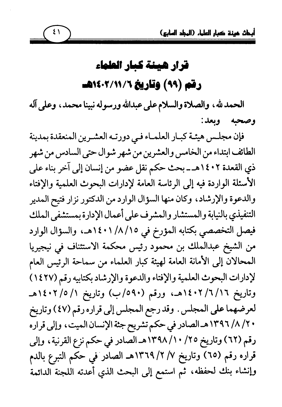 فإن مجلس هيئة كبار العلماء في دورته العشرين المنعقدة بمدينة الطائف ابتداء من الخامس والعشرين من شهر شوال حتى السادس من شهر ذي القعدة 1402هـ - بحث حكم نقل عضو من إنسان إلى آخر بناء على الأسئلة الواردة فيه إلى الرئاسة العامة لإدارات البحوث العلمية والإفتاء والدعوة والإرشاد، وكان منها السؤال الوارد من الدكتور نزار فتيح المدير التنفيذي بالنيابة والمستشار والمشرف على أعمال الإدارة بمستشفى الملك فيصل التخصصي بكتابه المؤرخ في 15\8\ 1401 هـ، والسؤال الوارد من الشيخ عبد الملك بن محمود رئيس محكمة الاستئناف في نيجيريا المحالان إلى الأمانة العامة لهيئة كبار العلماء من سماحة الرئيس العام لإدارات البحوث العلمية والإفتاء والدعوة والإرشاد بكتابيه رقم (1427) وتاريخ 16\6\1402 هـ، ورقم (590\ ب) وتاريخ 1\5\1402 هـ لعرضهما على المجلس. وقد رجع المجلس إلى قراره رقم (47) وتاريخ 20\8\1396 هـ الصادر في حكم تشريح جثة الإنسان الميت، وإلى قراره رقم (62) وتاريخ 25\10\1398 هـ الصادر في حكم نزع القرنية، وإلى قراره رقم (65) وتاريخ 7\2\1399 هـ الصادر في حكم التبرع بالدم وإنشاء بنك لحفظه، ثم استمع إلى البحث الذي أعدته اللجنة الدائمة