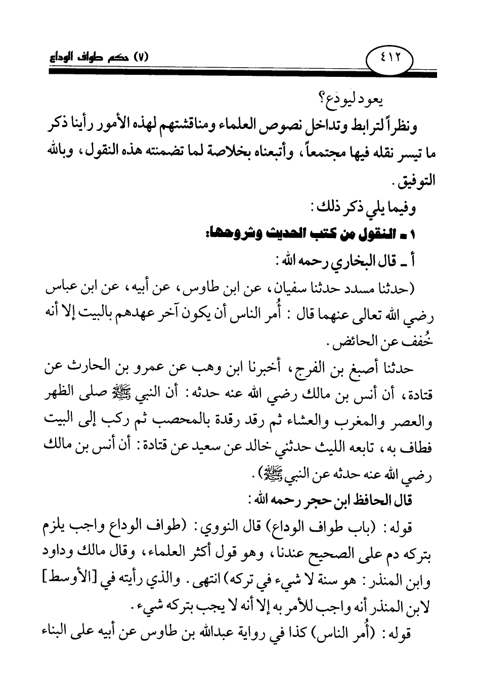 قوله: (باب طواف الوداع) قال النووي: (طواف الوداع واجب يلزم بتركه دم على الصحيح عندنا، وهو قول أكثر العلماء، وقال مالك وداود وابن المنذر: هو سنة لا شيء في تركه) انتهى. والذي رأيته في [الأوسط] لابن المنذر أنه واجب للأمر به إلا أنه لا يجب بتركه شيء.