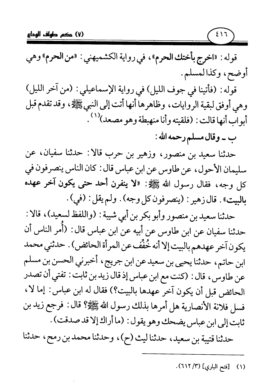حدثنا سعيد بن منصور، وزهير بن حرب قالا: حدثنا سفيان، عن سليمان الأحول، عن طاوس عن ابن عباس قال: كان الناس ينصرفون في كل وجه، فقال رسول الله صلى الله عليه وسلم: «لا ينفرن أحد حتى يكون آخر عهده بالبيت (¬6) » . قال زهير: (ينصرفون كل وجه) . ولم يقل: (في) .