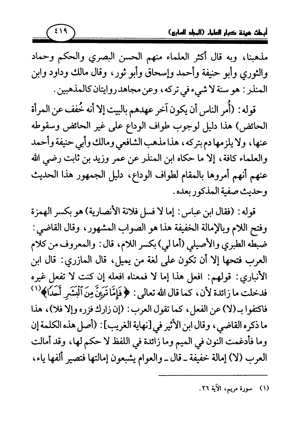قوله: (فقال ابن عباس: إما لا فسل فلانة الأنصارية) هو بكسر الهمزة وفتح اللام وبالإمالة الخفيفة هذا هو الصواب المشهور، وقال القاضي: ضبطه الطبري والأصيلي (أما لي) بكسر اللام، قال: والمعروف من كلام العرب فتحها إلا أن تكون على لغة من يميل، قال المازري: قال ابن الأنباري: قولهم: افعل هذا إما لا فمعناه افعله إن كنت لا تفعل غيره فدخلت ما زائدة لأن، كما قال الله تعالى: {فَإِمَّا تَرَيِنَّ مِنَ الْبَشَرِ أَحَدًا} (¬2) فاكتفوا بـ (لا) عن الفعل، كما تقول العرب: (إن زارك فزره وإلا فلا) ، هذا ما ذكره القاضي، وقال ابن الأثير في [نهاية الغريب] : (أصل هذه الكلمة إن وما فأدغمت النون في الميم وما زائدة في اللفظ لا حكم لها، وقد أمالت العرب (لا) إمالة خفيفة - قال - والعوام يشبعون إمالتها فتصير ألفها ياء،