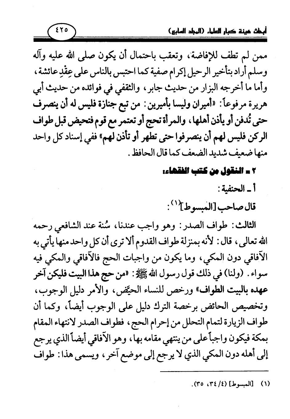 ممن لم تطف للإفاضة، وتعقب باحتمال أن يكون صلى الله عليه وآله وسلم أراد بتأخير الرحيل إكرام صفية كما احتبس بالناس على عقد عائشة، وأما ما أخرجه البزار من حديث جابر، والثقفي في فوائده من حديث أبي هريرة مرفوعا: «أميران وليسا بأميرين: من تبع جنازة فليس له أن ينصرف حتى تدفن أو يأذن أهلها، والمرأة تحج أو تعتمر مع قوم فتحيض قبل طواف الركن فليس لهم أن ينصرفوا حتى تطهر أو تأذن لهم» ففي إسناد كل واحد منها ضعيف شديد الضعف كما قال الحافظ.