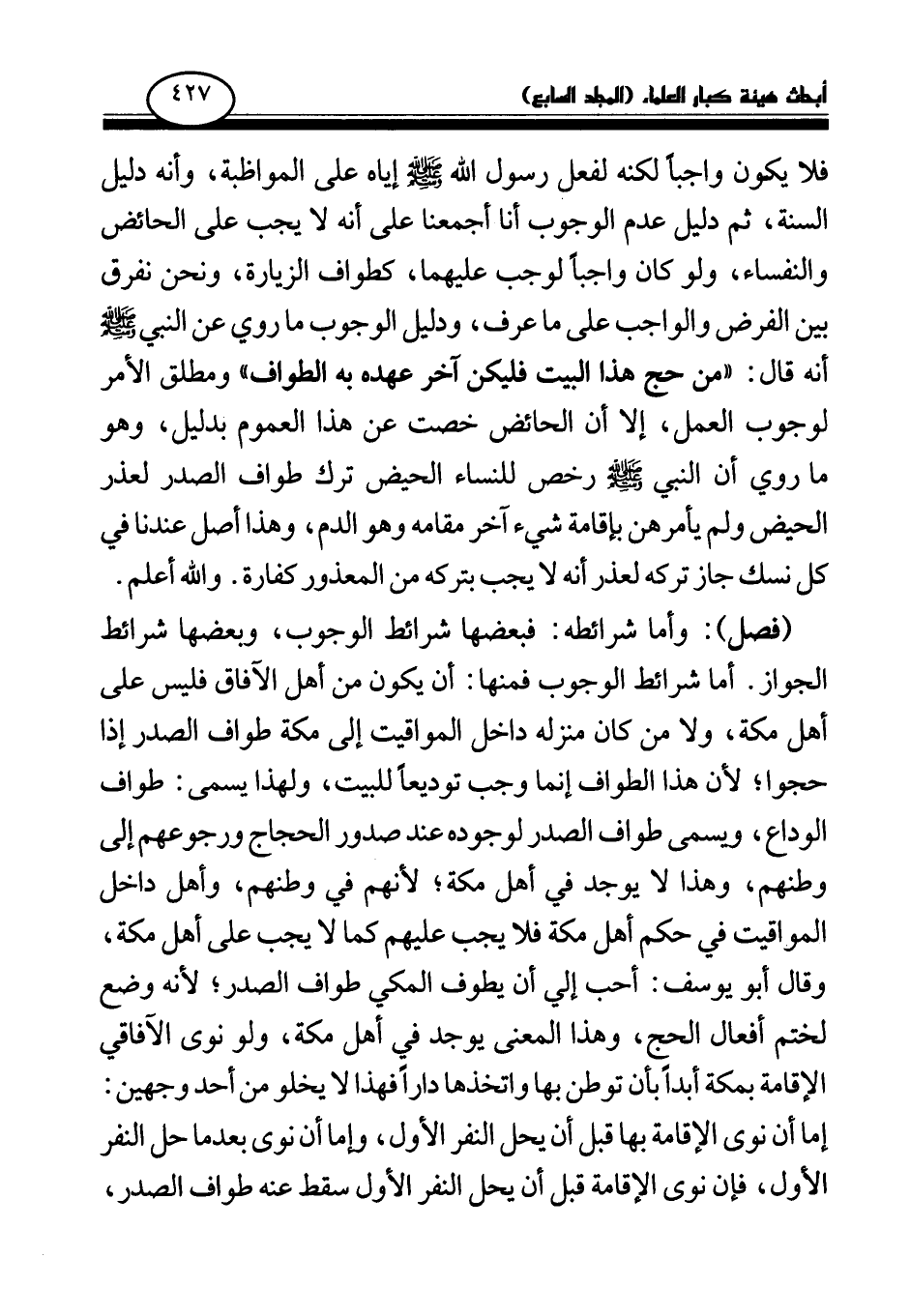 فلا يكون واجبا لكنه لفعل رسول الله صلى الله عليه وسلم إياه على المواظبة، وأنه دليل السنة، ثم دليل عدم الوجوب أنا أجمعنا على أنه لا يجب على الحائض والنفساء، ولو كان واجبا لوجب عليهما، كطواف الزيارة، ونحن نفرق بين الفرض والواجب على ما عرف، ودليل الوجوب ما روي عن النبي صلى الله عليه وسلم أنه قال: «من حج هذا البيت فليكن آخر عهده به الطواف (¬1) » ومطلق الأمر لوجوب العمل، إلا أن الحائض خصت عن هذا العموم بدليل، وهو ما روي أن النبي صلى الله عليه وسلم رخص للنساء الحيض ترك طواف الصدر لعذر الحيض ولم يأمرهن بإقامة شيء آخر مقامه وهو الدم، وهذا أصل عندنا في كل نسك جاز تركه لعذر أنه لا يجب بتركه من المعذور كفارة. والله أعلم.