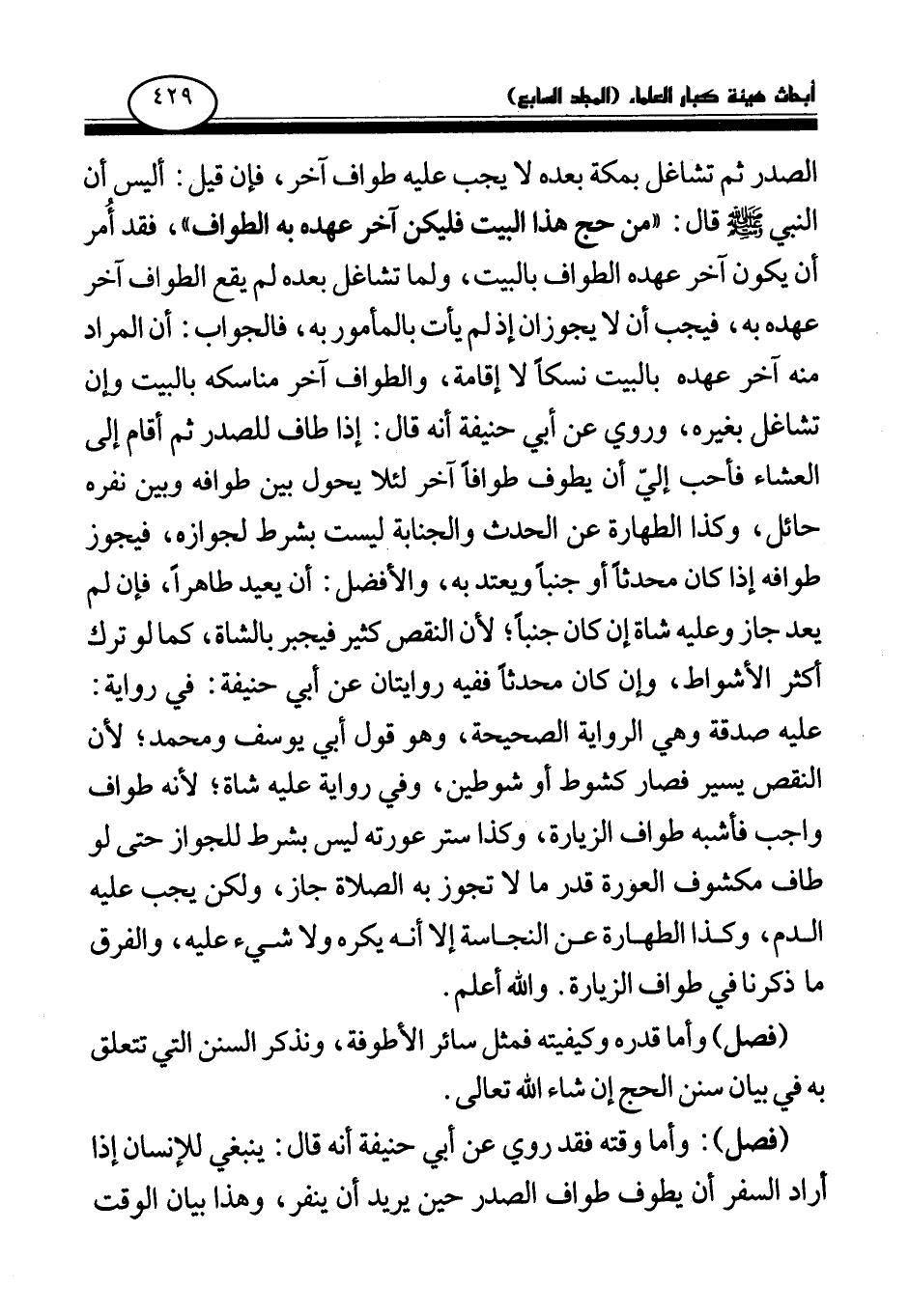 الصدر ثم تشاغل بمكة بعده لا يجب عليه طواف آخر، فإن قيل: أليس أن النبي صلى الله عليه وسلم قال: «من حج هذا البيت فليكن آخر عهده به الطواف (¬1) » ، فقد أمر أن يكون آخر عهده الطواف بالبيت، ولما تشاغل بعده لم يقع الطواف آخر عهده به، فيجب أن لا يجوزان إذ لم يأت بالمأمور به، فالجواب: أن المراد منه آخر عهده بالبيت نسكا لا إقامة، والطواف آخر مناسكه بالبيت وإن تشاغل بغيره، وروي عن أبي حنيفة أنه قال: إذا طاف للصدر ثم أقام إلى العشاء فأحب إلي أن يطوف طوافا آخر لئلا يحول بين طوافه وبين نفره حائل، وكذا الطهارة عن الحدث والجنابة ليست بشرط لجوازه، فيجوز طوافه إذا كان محدثا أو جنبا ويعتد به، والأفضل: أن يعيد طاهرا، فإن لم يعد جاز وعليه شاة إن كان جنبا؛ لأن النقص كثير فيجبر بالشاة، كما لو ترك أكثر الأشواط، وإن كان محدثا ففيه روايتان عن أبي حنيفة: في رواية: عليه صدقة وهي الرواية الصحيحة، وهو قول أبي يوسف ومحمد؛ لأن النقص يسير فصار كشوط أو شوطين، وفي رواية عليه شاة؛ لأنه طواف واجب فأشبه طواف الزيارة، وكذا ستر عورته ليس بشرط للجواز حتى لو طاف مكشوف العورة قدر ما لا تجوز به الصلاة جاز، ولكن يجب عليه الدم، وكذا الطهارة عن النجاسة إلا أنه يكره ولا شيء عليه، والفرق ما ذكرنا في طواف الزيارة. والله أعلم.