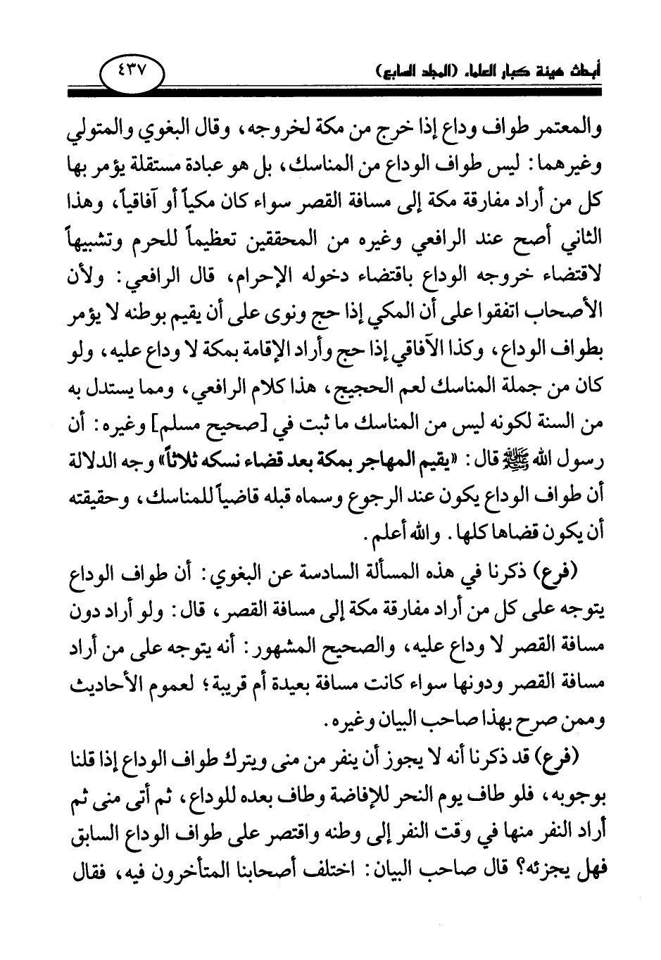 (فرع) ذكرنا في هذه المسألة السادسة عن البغوي: أن طواف الوداع يتوجه على كل من أراد مفارقة مكة إلى مسافة القصر، قال: ولو أراد دون مسافة القصر لا وداع عليه، والصحيح المشهور: أنه يتوجه على من أراد مسافة القصر ودونها سواء كانت مسافة بعيدة أم قريبة؛ لعموم الأحاديث وممن صرح بهذا صاحب البيان وغيره.
