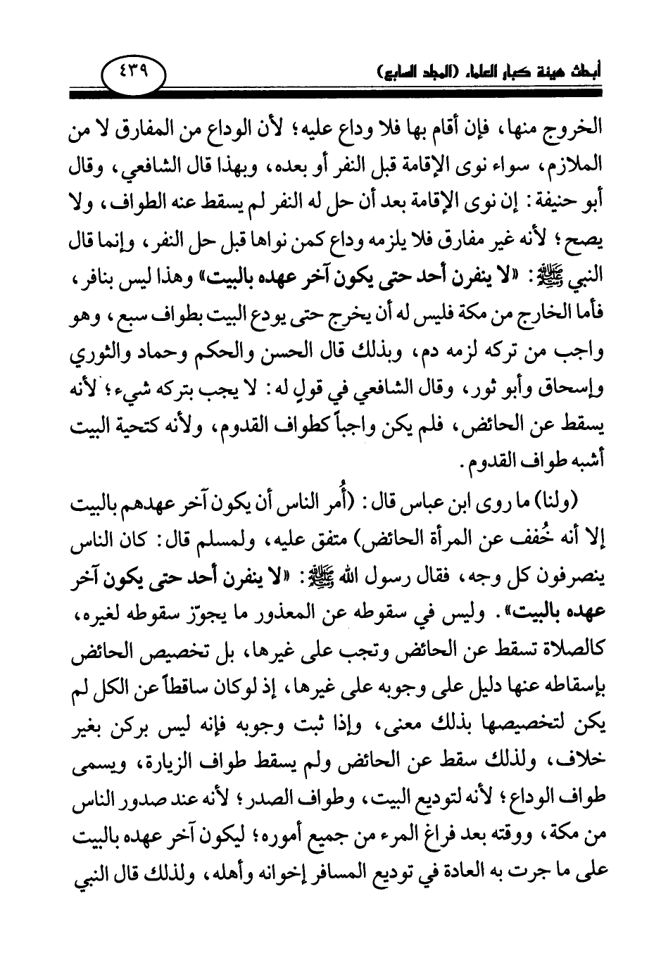 الخروج منها، فإن أقام بها فلا وداع عليه؛ لأن الوداع من المفارق لا من الملازم، سواء نوى الإقامة قبل النفر أو بعده، وبهذا قال الشافعي، وقال أبو حنيفة: إن نوى الإقامة بعد أن حل له النفر لم يسقط عنه الطواف، ولا يصح؛ لأنه غير مفارق فلا يلزمه وداع كمن نواها قبل حل النفر، وإنما قال النبي صلى الله عليه وسلم: «لا ينفرن أحد حتى يكون آخر عهده بالبيت (¬1) » وهذا ليس بنافر، فأما الخارج من مكة فليس له أن يخرج حتى يودع البيت بطواف سبع، وهو واجب من تركه لزمه دم، وبذلك قال الحسن والحكم وحماد والثوري وإسحاق وأبو ثور، وقال الشافعي في قول له: لا يجب بتركه شيء؛ لأنه يسقط عن الحائض، فلم يكن واجبا كطواف القدوم، ولأنه كتحية البيت أشبه طواف القدوم.