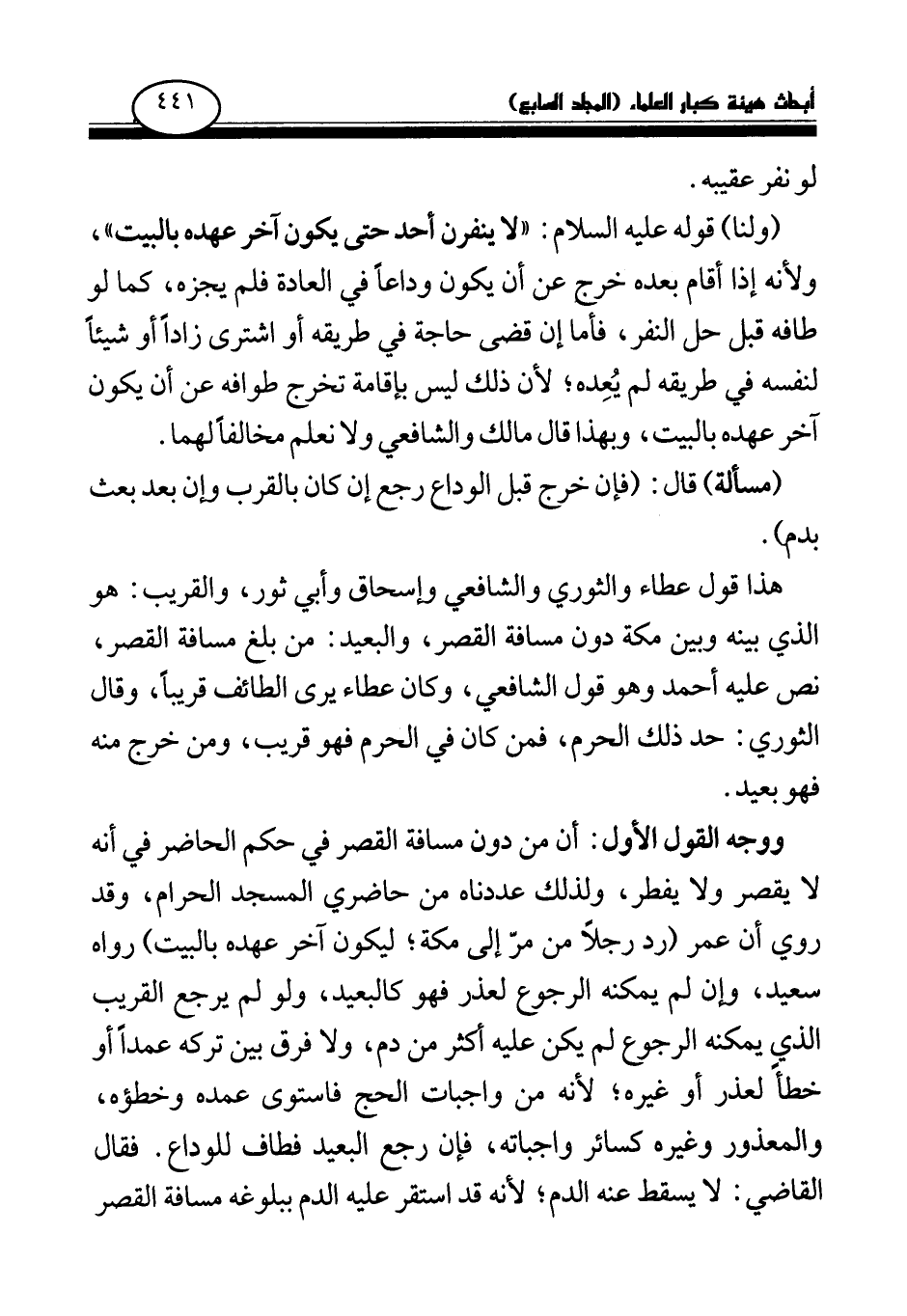 ووجه القول الأول: أن من دون مسافة القصر في حكم الحاضر في أنه لا يقصر ولا يفطر، ولذلك عددناه من حاضري المسجد الحرام، وقد روي أن عمر (رد رجلا من مر إلى مكة؛ ليكون آخر عهده بالبيت) رواه سعيد، وإن لم يمكنه الرجوع لعذر فهو كالبعيد، ولو لم يرجع القريب الذي يمكنه الرجوع لم يكن عليه أكثر من دم، ولا فرق بين تركه عمدا أو خطأ لعذر أو غيره؛ لأنه من واجبات الحج فاستوى عمده وخطؤه، والمعذور وغيره كسائر واجباته، فإن رجع البعيد فطاف للوداع. فقال القاضي: لا يسقط عنه الدم؛ لأنه قد استقر عليه الدم ببلوغه مسافة القصر