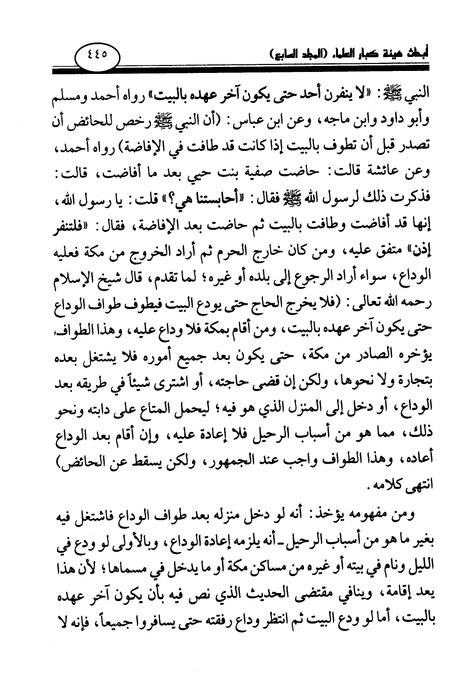 النبي صلى الله عليه وسلم: «لا ينفرن أحد حتى يكون آخر عهده بالبيت (¬1) » رواه أحمد ومسلم وأبو داود وابن ماجه، وعن ابن عباس: «أن النبي صلى الله عليه وسلم رخص للحائض أن تصدر قبل أن تطوف بالبيت إذا كانت قد طافت في الإفاضة (¬2) » رواه أحمد، وعن عائشة قالت: «حاضت صفية بنت حيي بعدما أفاضت، قالت: فذكرت ذلك لرسول الله صلى الله عليه وسلم فقال: " أحابستنا هي؟ " قلت: يا رسول الله، إنها قد أفاضت وطافت بالبيت ثم حاضت بعد الإفاضة، فقال: فلتنفر إذن (¬3) » متفق عليه، ومن كان خارج الحرم ثم أراد الخروج من مكة فعليه الوداع، سواء أراد الرجوع إلى بلده أو غيره؛ لما تقدم، قال شيخ الإسلام رحمه الله تعالى: (فلا يخرج الحاج حتى يودع البيت فيطوف طواف الوداع حتى يكون آخر عهده بالبيت، ومن أقام بمكة فلا وداع عليه، وهذا الطواف يؤخره الصادر من مكة، حتى يكون بعد جميع أموره فلا يشتغل بعده بتجارة ولا نحوها، ولكن إن قضى حاجته، أو اشترى شيئا في طريقه بعد الوداع، أو دخل إلى المنزل الذي هو فيه؛ ليحمل المتاع على دابته ونحو ذلك، مما هو من أسباب الرحيل فلا إعادة عليه، وإن أقام بعد الوداع أعاده، وهذا الطواف واجب عند الجمهور، ولكن يسقط عن الحائض) انتهى كلامه.