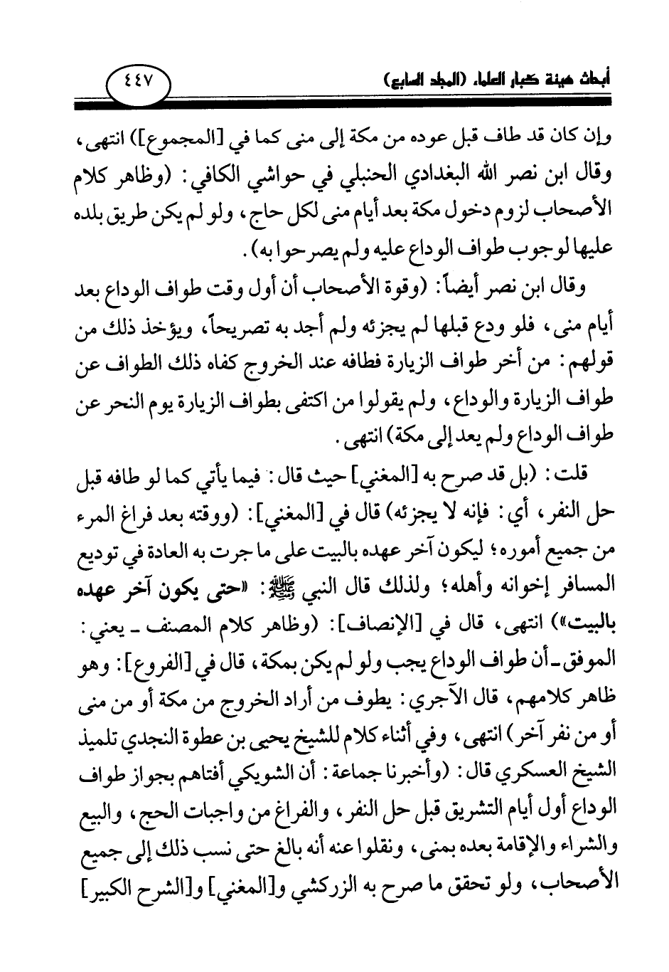 وإن كان قد طاف قبل عوده من مكة إلى منى كما في [المجموع] ) انتهى، وقال ابن نصر الله البغدادي الحنبلي في حواشي الكافي: (وظاهر كلام الأصحاب لزوم دخول مكة بعد أيام منى لكل حاج، ولو لم يكن طريق بلده عليها لوجوب طواف الوداع عليه ولم يصرحوا به) .