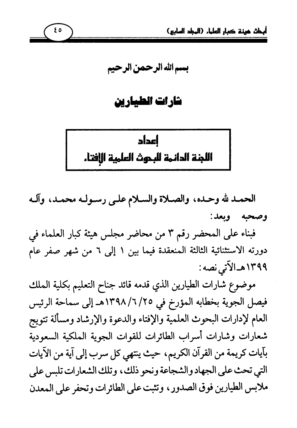 موضوع شارات الطيارين الذي قدمه قائد جناح التعليم بكلية الملك فيصل الجوية بخطابه المؤرخ في 25\6\1398 هـ إلى سماحة الرئيس العام لإدارات البحوث العلمية والإفتاء والدعوة والإرشاد ومسألة تتويج شعارات وشارات أسراب الطائرات للقوات الجوية الملكية السعودية بآيات كريمة من القرآن الكريم، حيث ينتهي كل سرب إلى آية من الآيات التي تحث على الجهاد والشجاعة ونحو ذلك، وتلك الشعارات تلبس على ملابس الطيارين فوق الصدور، وتثبت على الطائرات وتحفر على المعدن