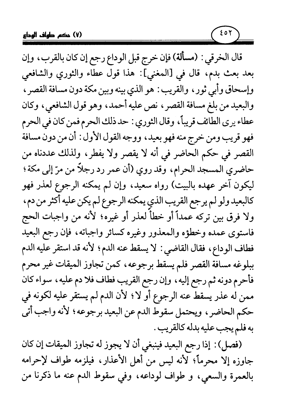 قال الخرقي: (مسألة) فإن خرج قبل الوداع رجع إن كان بالقرب، وإن بعد بعث بدم، قال في [المغني] : هذا قول عطاء والثوري والشافعي وإسحاق وأبي ثور، والقريب: هو الذي بينه وبين مكة دون مسافة القصر، والبعيد من بلغ مسافة القصر، نص عليه أحمد، وهو قول الشافعي، وكان عطاء يرى الطائف قريبا، وقال الثوري: حد ذلك الحرم فمن كان في الحرم فهو قريب ومن خرج منه فهو بعيد، ووجه القول الأول: أن من دون مسافة القصر في حكم الحاضر في أنه لا يقصر ولا يفطر، ولذلك عددناه من حاضري المسجد الحرام.