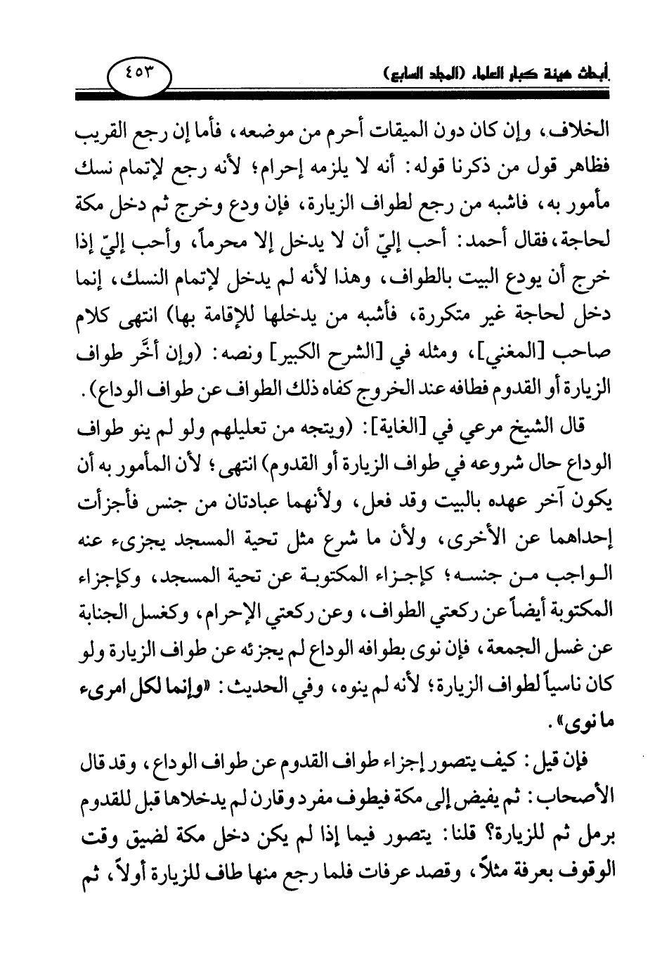 الخلاف، وإن كان دون الميقات أحرم من موضعه، فأما إن رجع القريب فظاهر قول من ذكرنا قوله: أنه لا يلزمه إحرام؛ لأنه رجع لإتمام نسك مأمور به، فأشبه من رجع لطواف الزيارة، فإن ودع وخرج ثم دخل مكة لحاجة، فقال أحمد: أحب إلي أن لا يدخل إلا محرما، وأحب إلي إذا خرج أن يودع البيت بالطواف؛ وهذا لأنه لم يدخل لإتمام النسك، إنما دخل لحاجة غير متكررة، فأشبه من يدخلها للإقامة بها) انتهى كلام صاحب [المغني] .