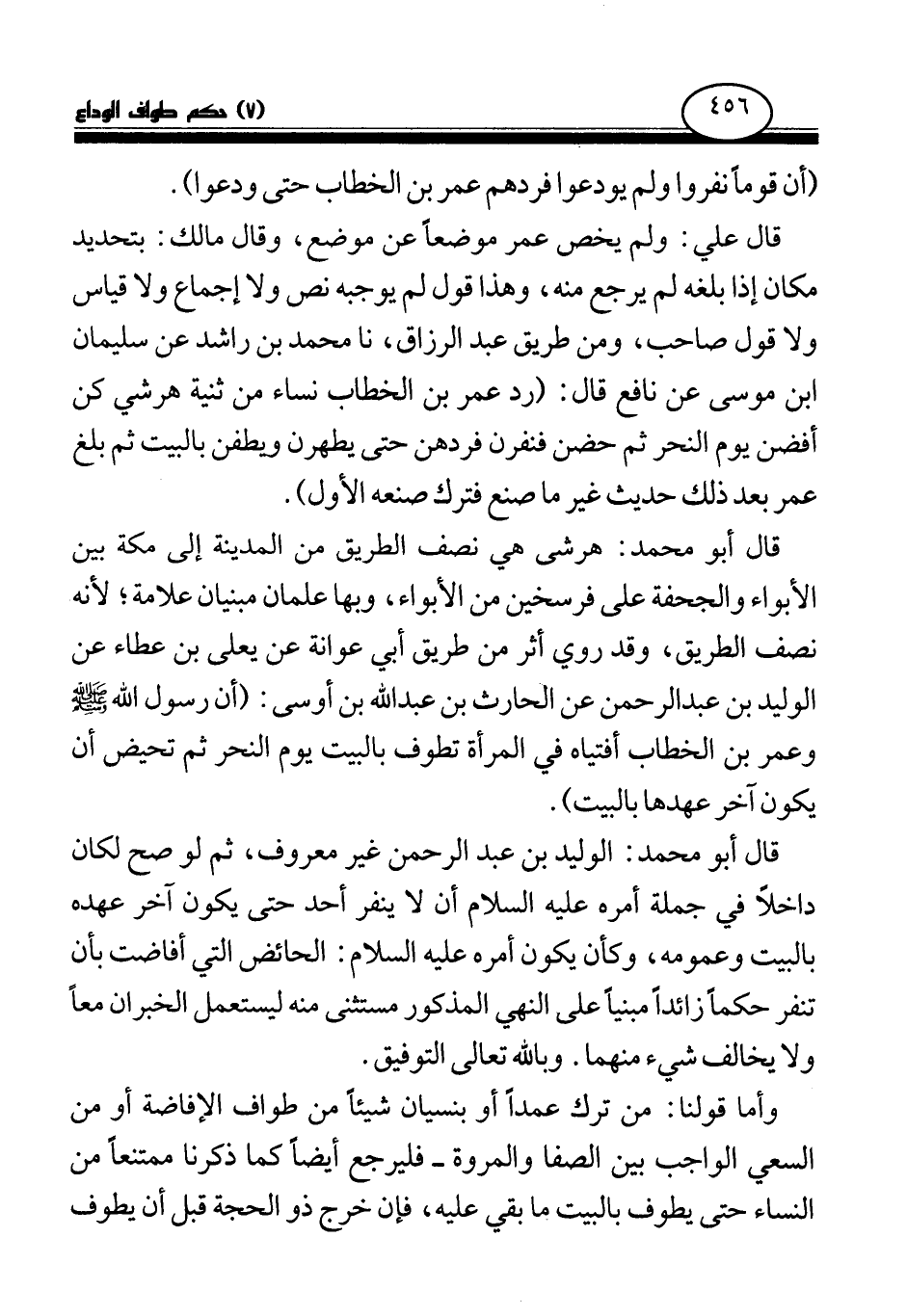 قال علي: ولم يخص عمر موضعا عن موضع، وقال مالك: بتحديد مكان إذا بلغه لم يرجع منه، وهذا قول لم يوجبه نص ولا إجماع ولا قياس ولا قول صاحب، ومن طريق عبد الرزاق، نا محمد بن راشد، عن سليمان بن موسى، عن نافع قال: (رد عمر بن الخطاب نساء من ثنية هرشي كن أفضن يوم النحر، ثم حضن فنفرن، فردهن حتى يطهرن، ويطفن بالبيت، ثم بلغ عمر بعد ذلك حديث غير ما صنع فترك صنعه الأول) .