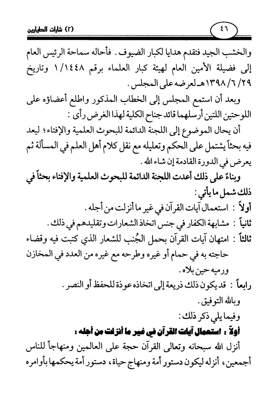 والخشب الجيد فتقدم هدايا لكبار الضيوف. فأحاله سماحة الرئيس العام إلى فضيلة الأمين العام لهيئة كبار العلماء برقم 1448\1 وتاريخ 29\6\1398 هـ لعرضه على المجلس.
