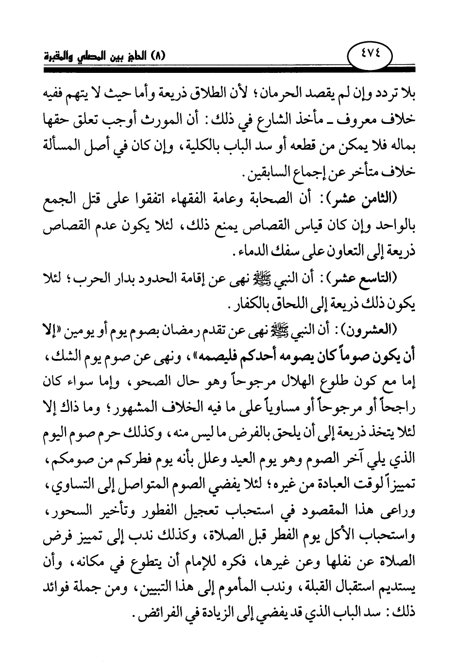 (العشرون) : أن النبي - صلى الله عليه وسلم - «نهى عن تقدم رمضان بصوم يوم أو يومين إلا أن يكون صوما كان يصومه أحدكم فليصمه (¬1) » ، «ونهى عن صوم يوم الشك (¬2) » ، إما مع كون طلوع الهلال مرجوحا وهو حال الصحو، وإما سواء كان راجحا أو مرجوحا أو مساويا على ما فيه الخلاف المشهور؛ وما ذاك إلا لئلا يتخذ ذريعة إلى أن يلحق بالفرض ما ليس منه، وكذلك حرم صوم اليوم الذي يلي آخر الصوم، وهو يوم العيد، وعلل بأنه يوم فطركم من صومكم، تمييزا لوقت العبادة من غيره؛ لئلا يفضي الصوم المتواصل إلى التساوي، وراعى هذا المقصود في استحباب تعجيل الفطور وتأخير السحور، واستحباب الأكل يوم الفطر قبل الصلاة، وكذلك ندب إلى تمييز فرض الصلاة عن نفلها وعن غيرها، فكره للإمام أن يتطوع في مكانه، وأن يستديم استقبال القبلة، وندب المأموم إلى هذا التبيين، ومن جملة فوائد ذلك: سد الباب الذي قد يفضي إلى الزيادة في الفرائض.