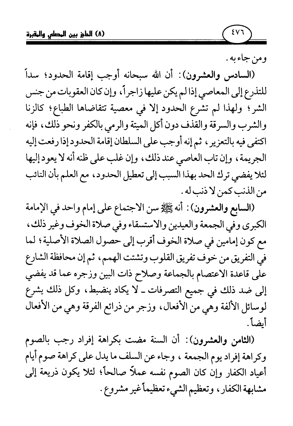(السادس والعشرون) : أن الله سبحانه أوجب إقامة الحدود؛ سدا للتذرع إلى المعاصي إذا لم يكن عليها زاجرا، وإن كان العقوبات من جنس الشر؛ ولهذا لم تشرع الحدود إلا في معصية تتقاضاها الطباع؛ كالزنا والشرب والسرقة والقذف دون أكل الميتة والرمي بالكفر ونحو ذلك، فإنه اكتفى فيه بالتعزير، ثم إنه أوجب على السلطان إقامة الحدود إذا رفعت إليه الجريمة، وإن تاب العاصي عند ذلك، وإن غلب على ظنه أنه لا يعود إليها لئلا يفضي ترك الحد بهذا السبب إلى تعطيل الحدود، مع العلم بأن التائب من الذنب كمن لا ذنب له.