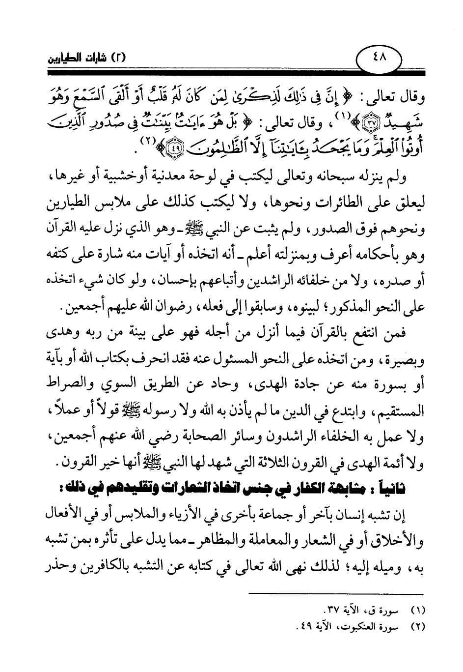 ولم ينزله سبحانه وتعالى ليكتب في لوحة معدنية أو خشبية أو غيرها، ليعلق على الطائرات ونحوها، ولا ليكتب كذلك على ملابس الطيارين ونحوهم فوق الصدور، ولم يثبت عن النبي صلى الله عليه وسلم - وهو الذي نزل عليه القرآن وهو بأحكامه أعرف وبمنزلته أعلم- أنه اتخذه أو آيات منه شارة على كتفه أو صدره، ولا من خلفائه الراشدين وأتباعهم بإحسان، ولو كان شيء اتخذه على النحو المذكور؛ لبينوه، وسابقوا إلى فعله، رضوان الله عليهم أجمعين.